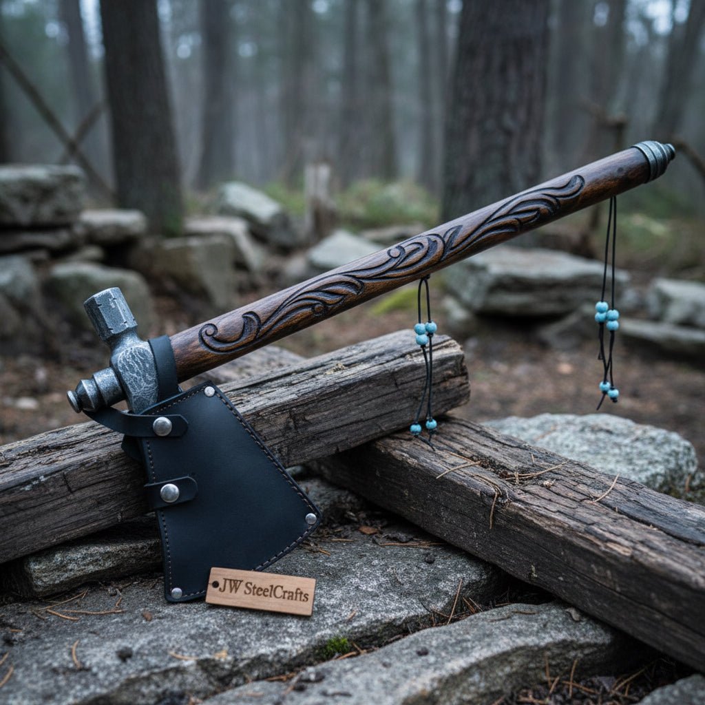 JW SteelCrafts craftsmen forge each axe head under controlled heat and hammer shaping. They carve the hardwood shaft individually and fit the steel head precisely for long-term structural integrity. This process ensures reliability and authenticity. Collectors who appreciate forged pipe axes often explore similar pieces such as the Artisan Damascus Smoking Axe with Sculpted Shaft.