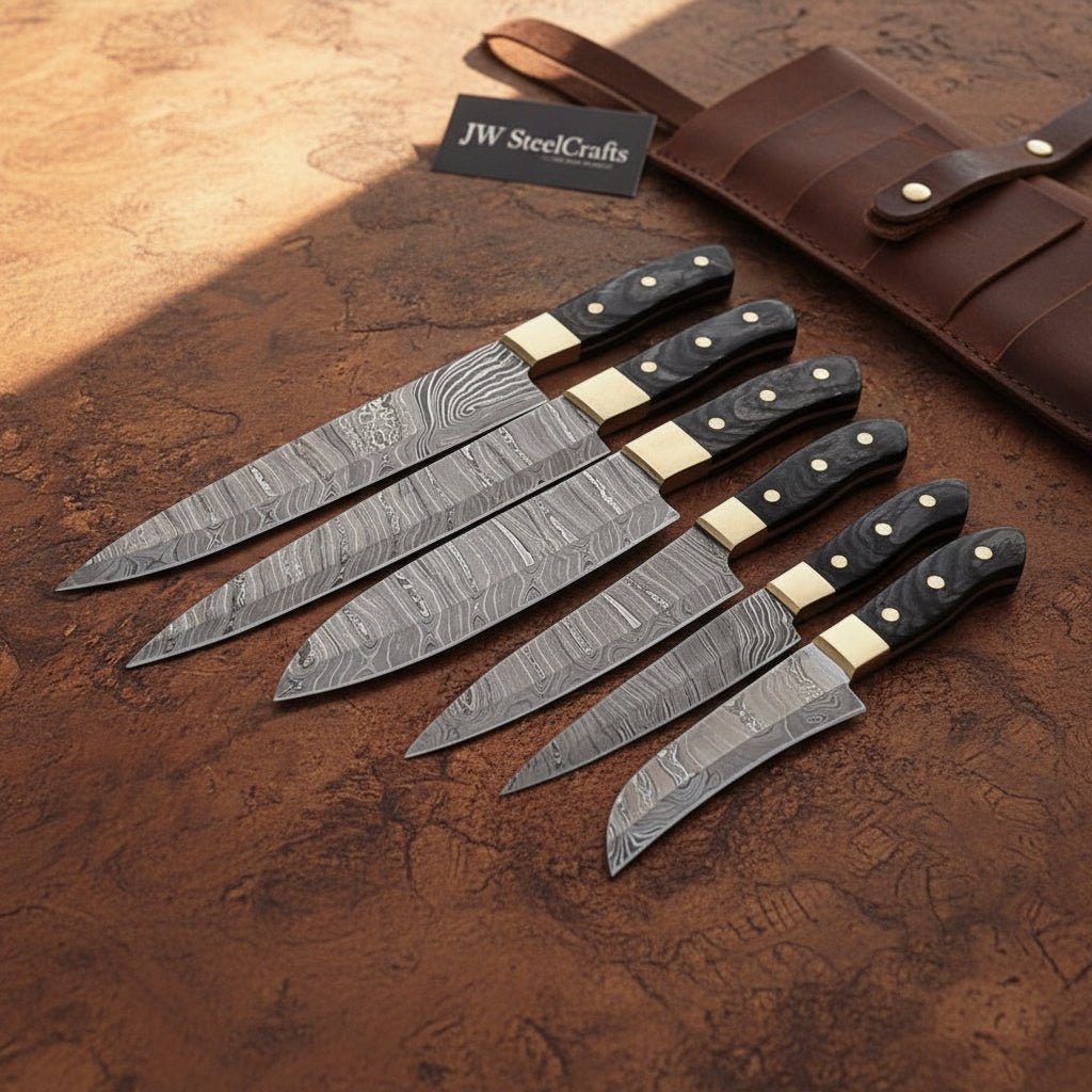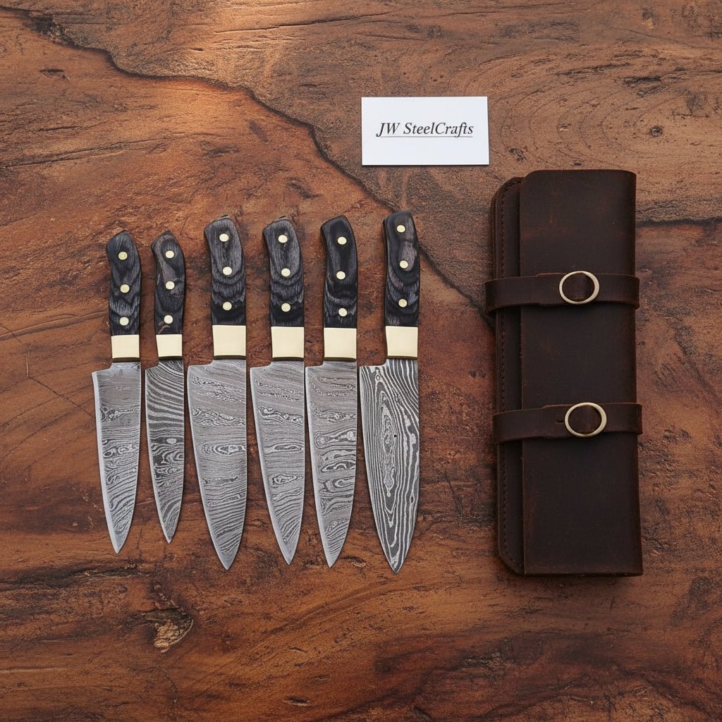 This 6-piece handmade Damascus kitchen knife set from JW SteelCrafts provides a complete professional blade selection designed for precision cutting, preparation, and finishing tasks. Each knife is forged to perform a specific function, allowing efficient workflow across vegetable preparation, protein processing, and detailed cutting work. The Damascus steel blades paired with black Pakka wood handles provide strength, stability, and controlled handling.