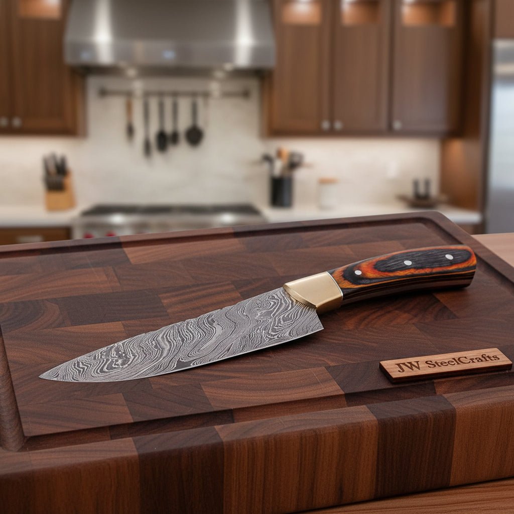 This chef knife is forged using traditional Damascus steel techniques, creating a blade designed for strength, edge retention, and controlled cutting. The blade profile supports efficient slicing, chopping, and general kitchen preparation. This knife follows the same forging standards used across the JW SteelCrafts Damascus chef knife collection, where each blade is crafted for daily reliability and precision.