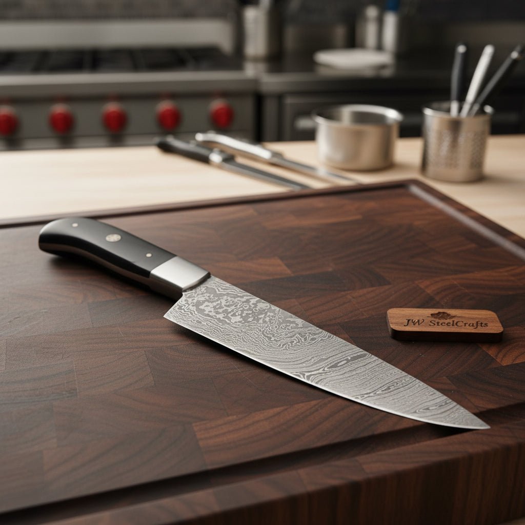 Each knife is individually forged and finished by hand. This process ensures proper blade alignment, cutting efficiency, and structural reliability. This same level of craftsmanship is maintained across our Damascus chef knife sets, trusted by professional cooks and collectors.