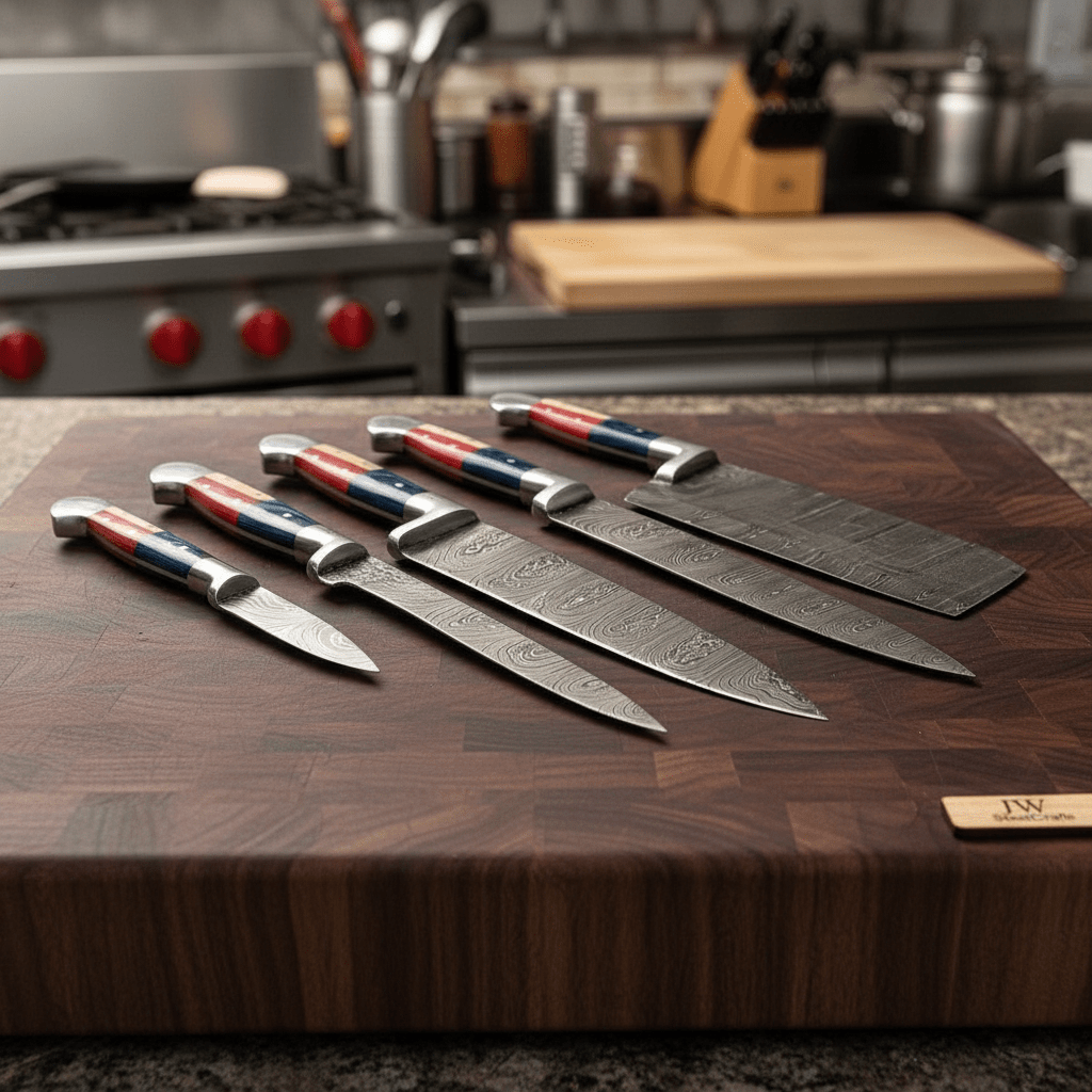 This complete kitchen knife set includes a meat cleaver, chef knife, carving slicer, petty utility knife, and paring knife. These blades support heavy chopping, meat slicing, trimming, and precision preparation. The Texas flag themed handles provide grip stability and visual distinction, while the included leather roll improves safe storage and transport. This set pairs well with premium collections such as the handmade Damascus kitchen knife set with bone and resin handles and the JW SteelCrafts hand forged Damascus knife set with mixed wood handles, both designed for professional culinary environments.