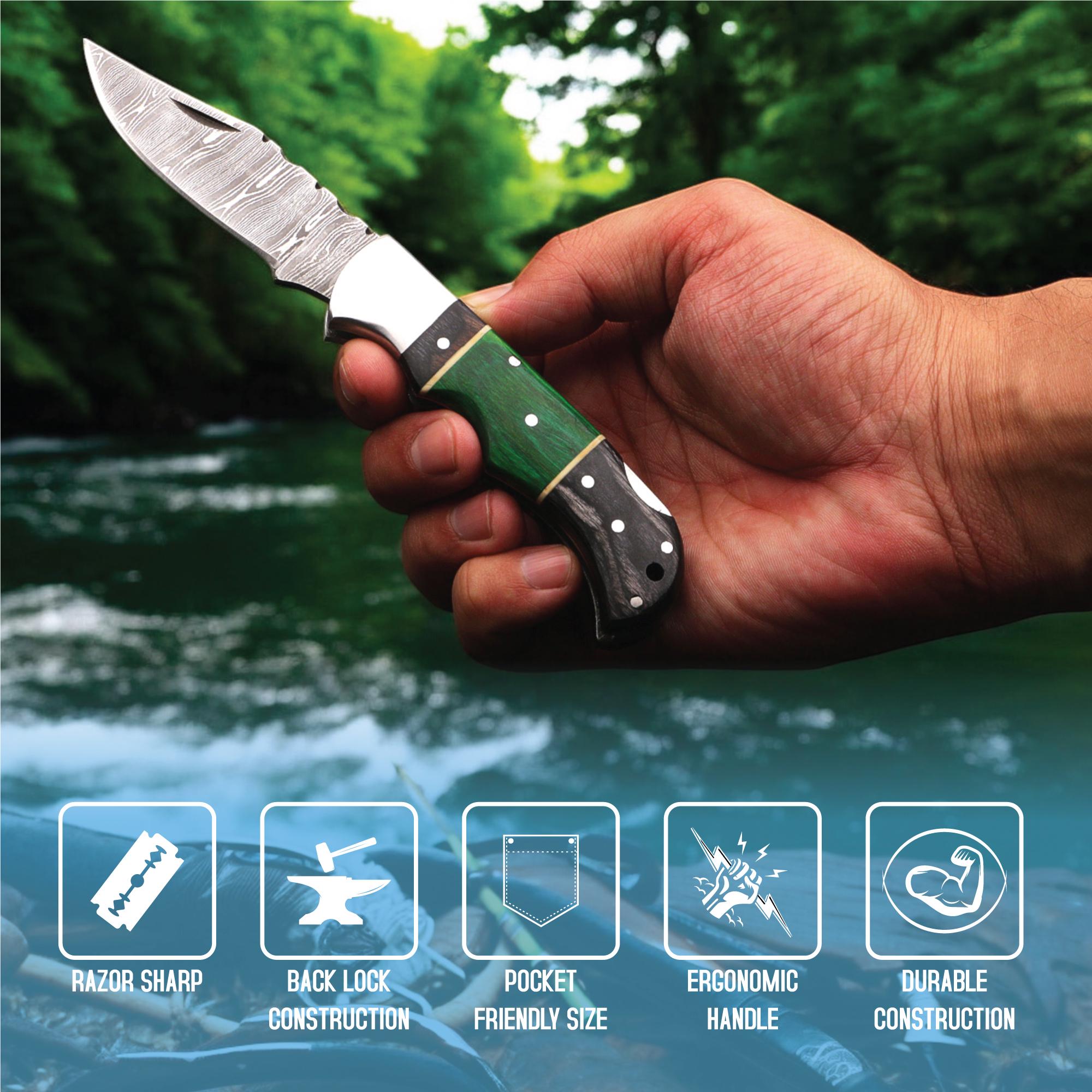 Handmade Damascus Steel Folding Knife – Green & Black Pakka Wood Handle