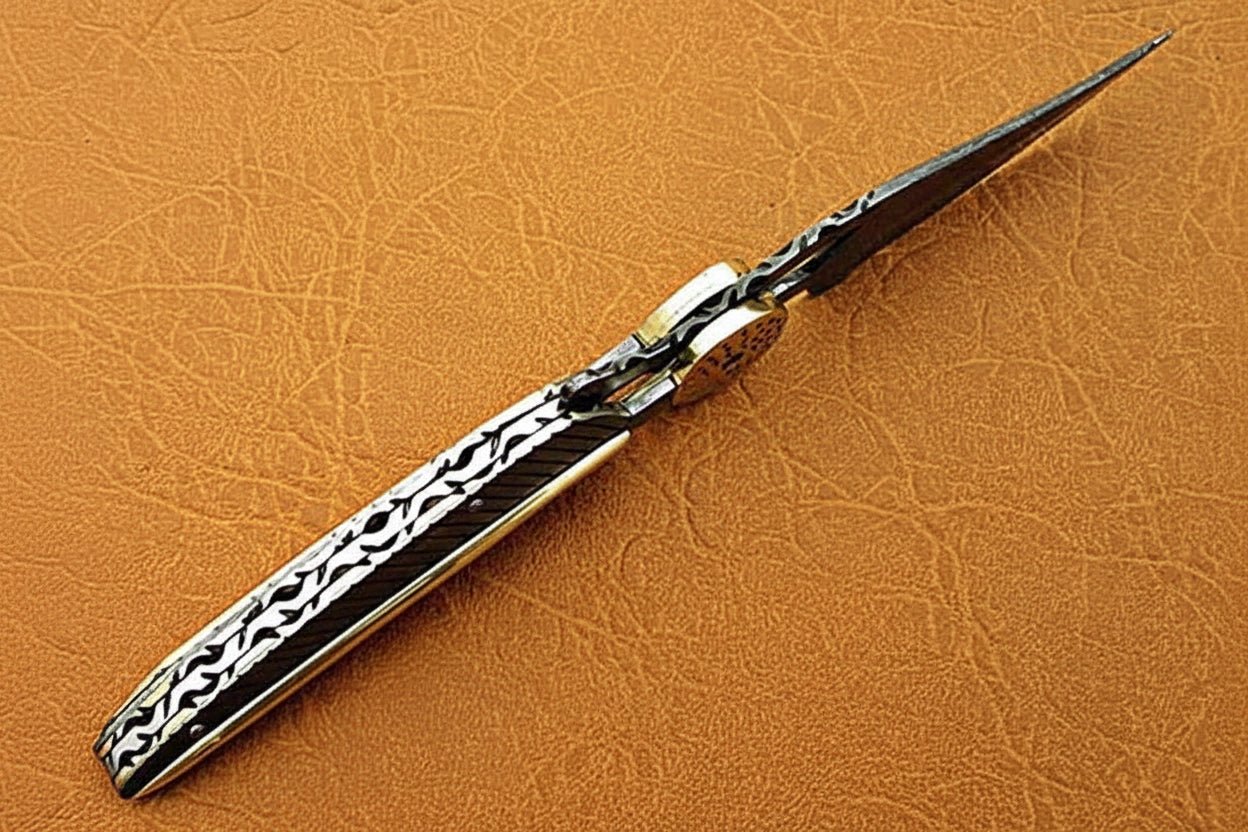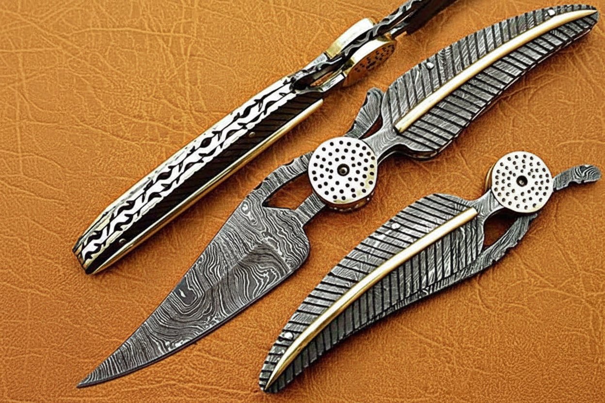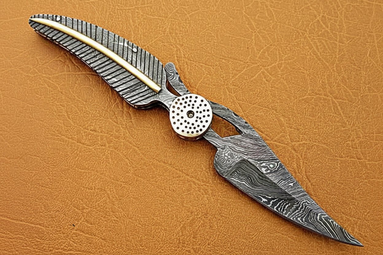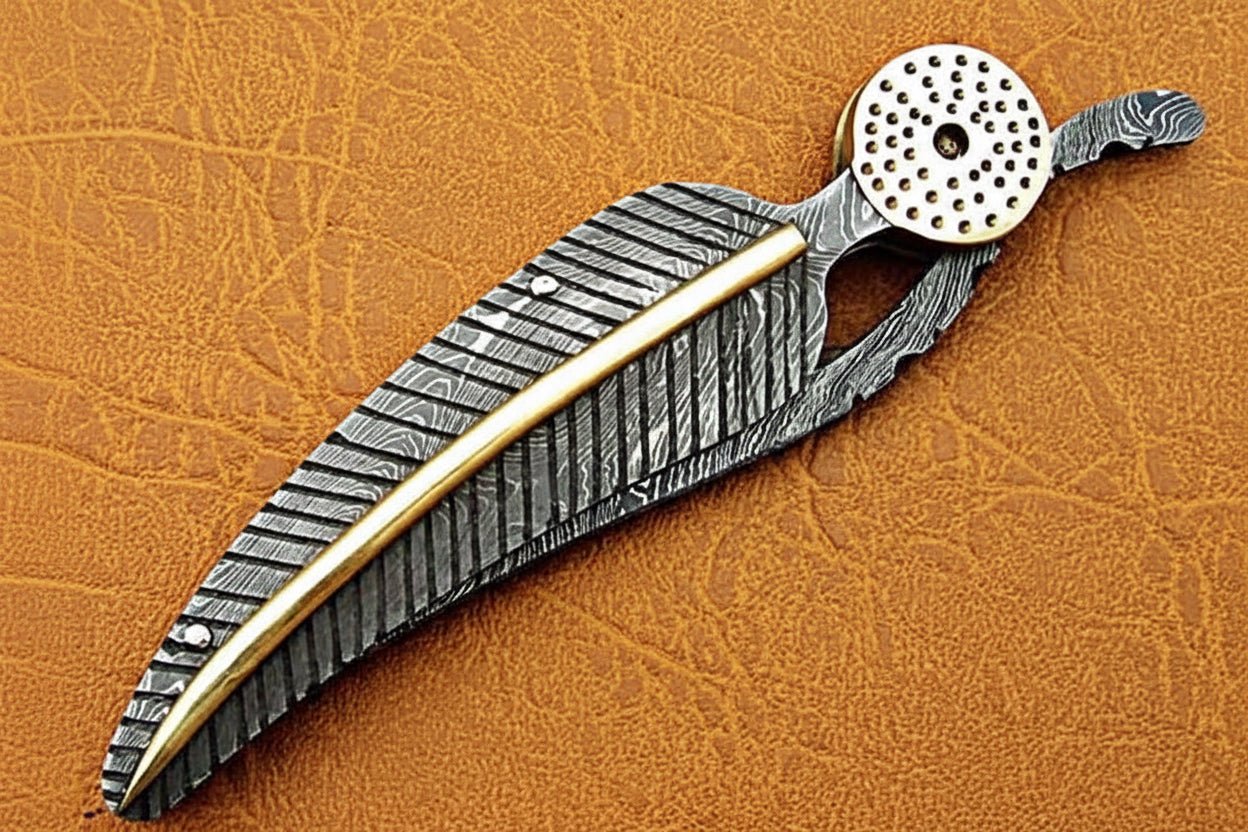 This handcrafted Damascus steel folding knife brings together clean function, solid balance, and sculptural metalwork. Built for people who appreciate knives that feel intentional in the hand, it combines a layered Damascus blade with a precision-shaped metal handle finished in feather-style texturing and a contrasting brass spine inlay.