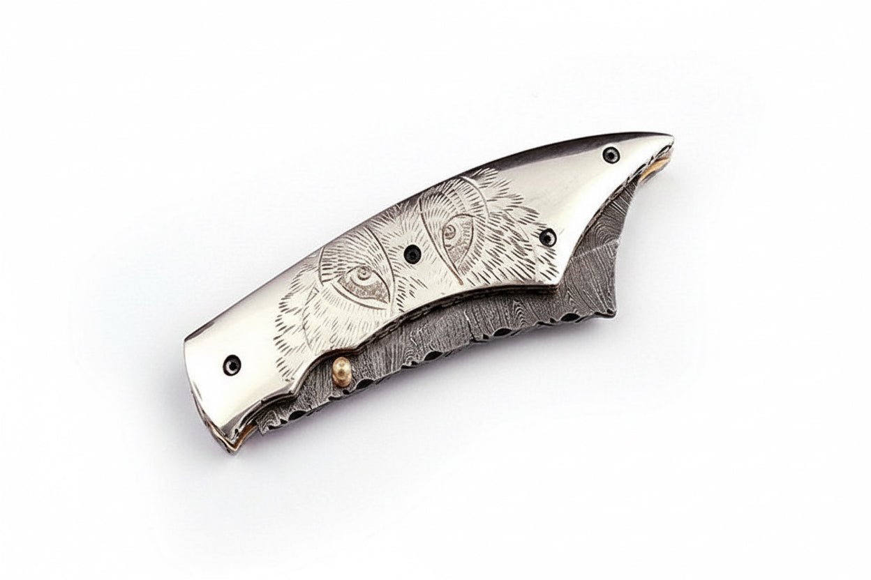 The handle is crafted from polished bone and finished with a hand-engraved wolf design. The wolf symbolizes strength, awareness, and independence, giving this knife a deeper personal character. Its curved shape sits naturally in the hand, offering comfort and balance during use.