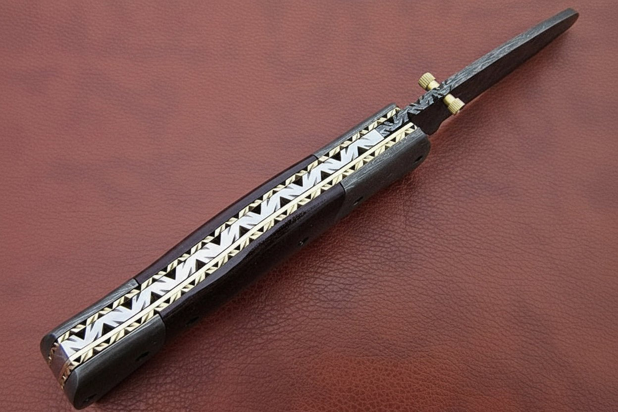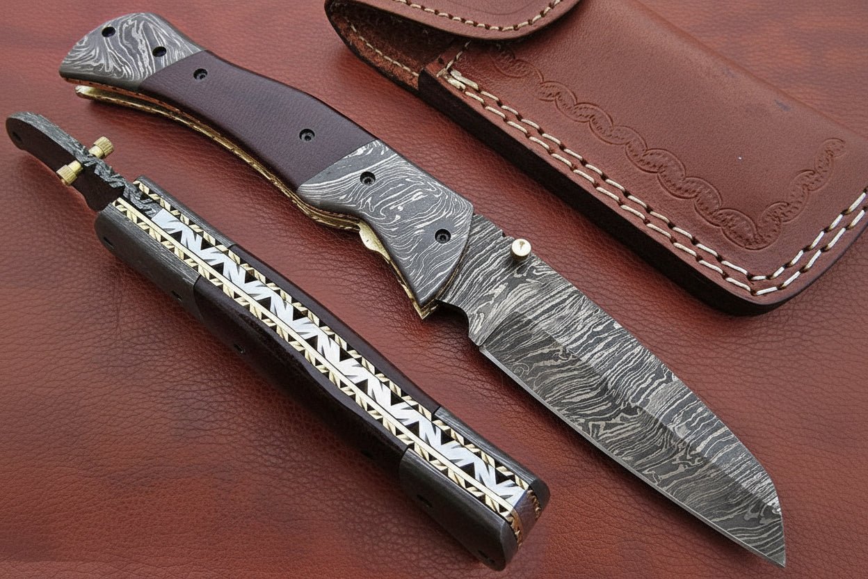 The blade is hand-forged from layered Damascus steel, forming natural patterns during the forging process. Each blade turns out slightly different, giving every knife its own character. A solid brass thumb stud allows smooth one-hand opening, while the reinforced spine adds strength where it matters.