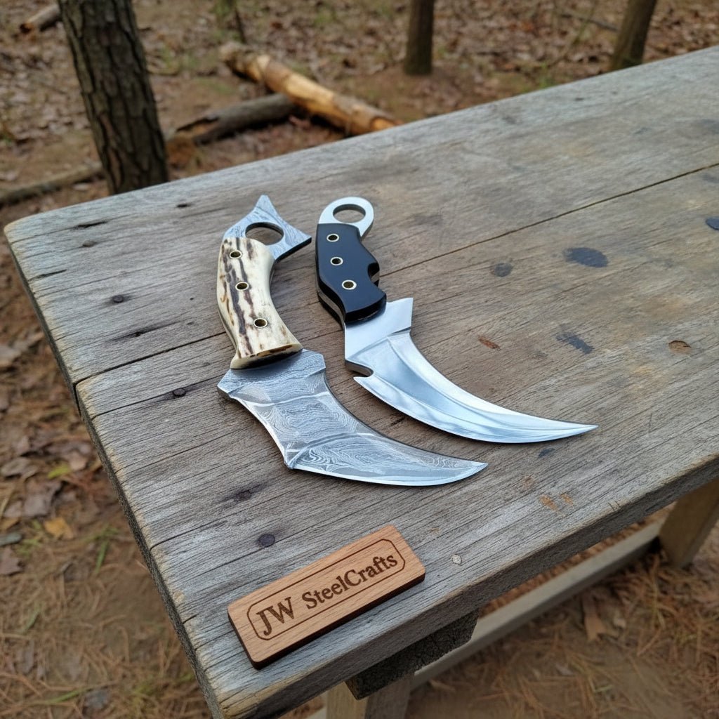 Discover the exquisite craftsmanship of the **kARAMBIT KNIFE COMBAT / FIGHTING KNIVES PAIR PATTERN WELDED BLADE** by JW SteelCrafts.