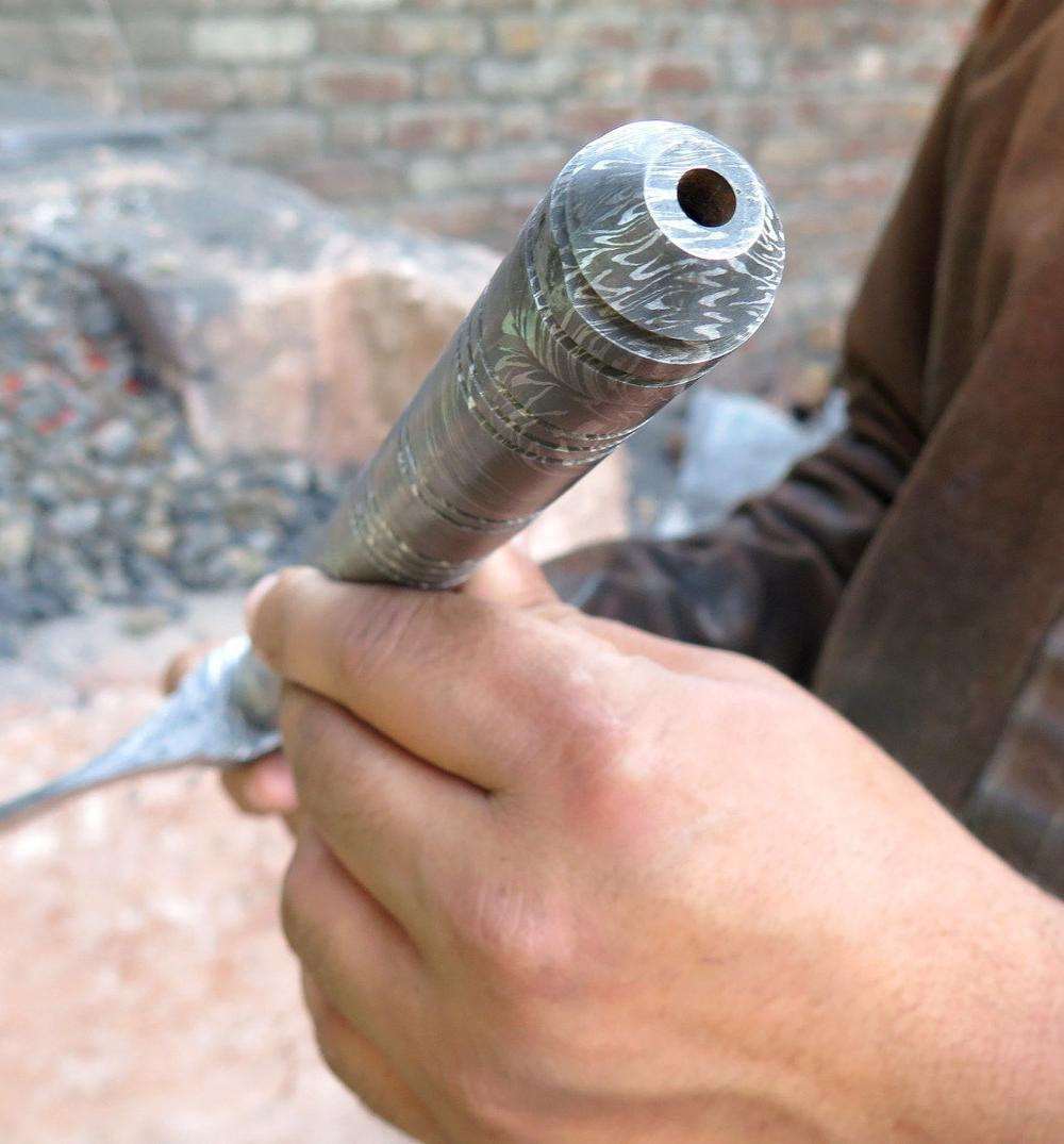 The Damascus steel blade is heat treated, hardened, and finished by hand. This ensures durability and lasting structural stability. The carved hardwood handle provides a secure grip and supports the internal pipe chamber.