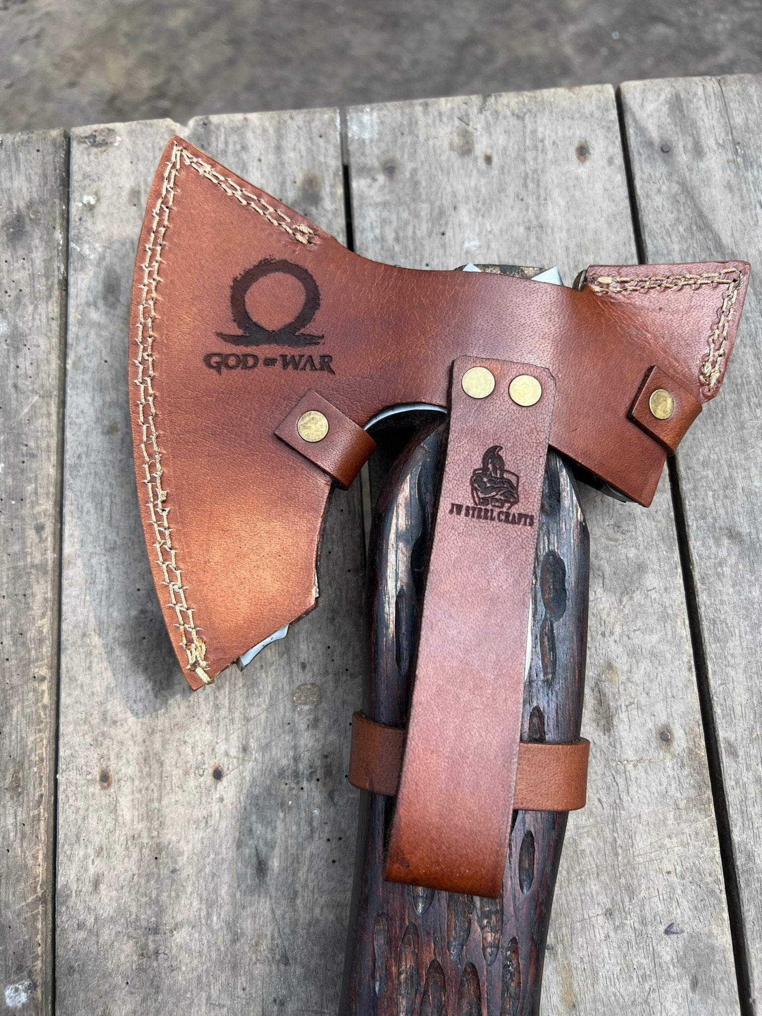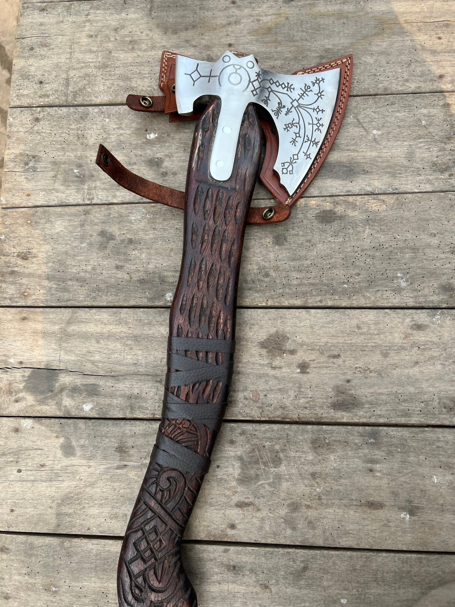 Explore related handmade pieces including the Damascus Viking axe with leather sheath, the double headed Viking collector axe, the engraved Norse hatchet collection, and the Viking axe and sword collector set.