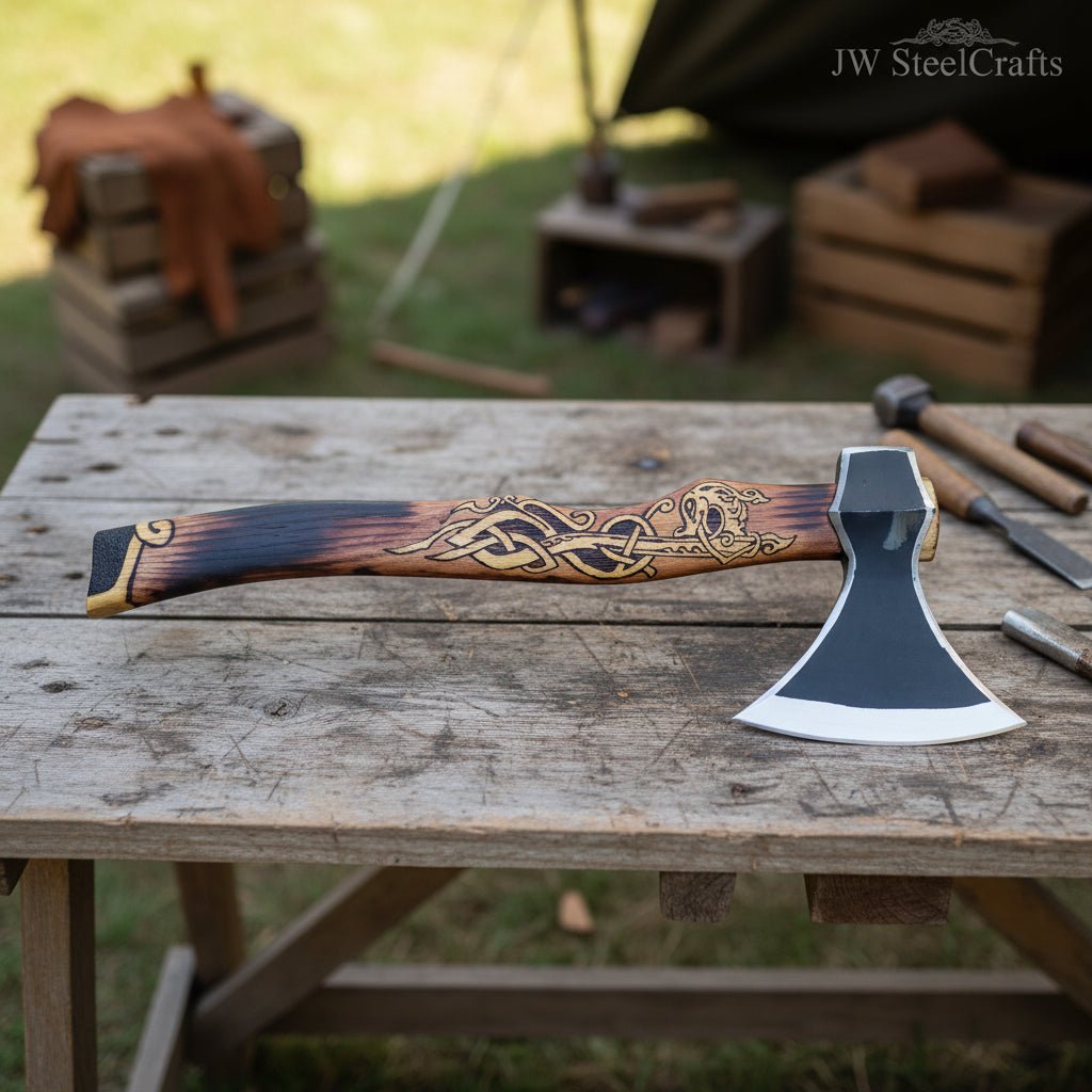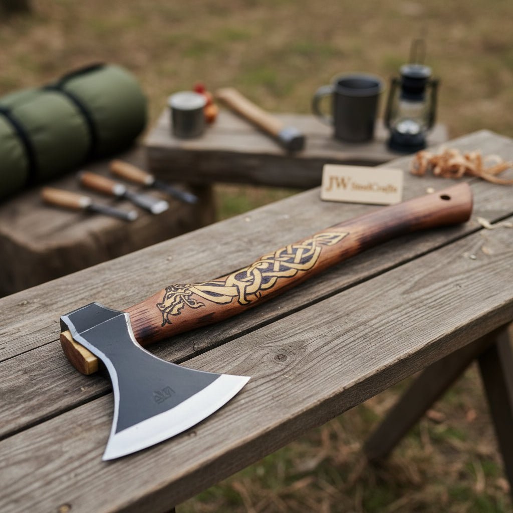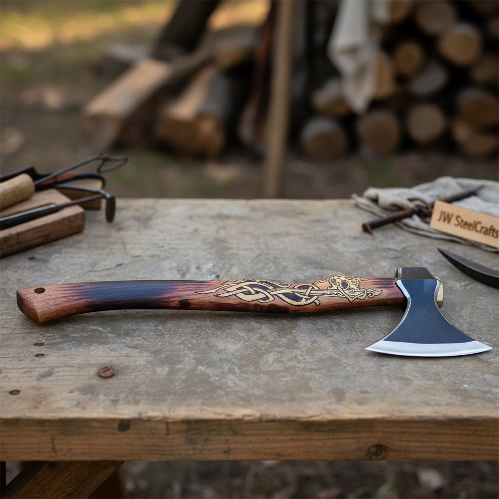 - Field-ready camping axe with artisan pattern steel blade