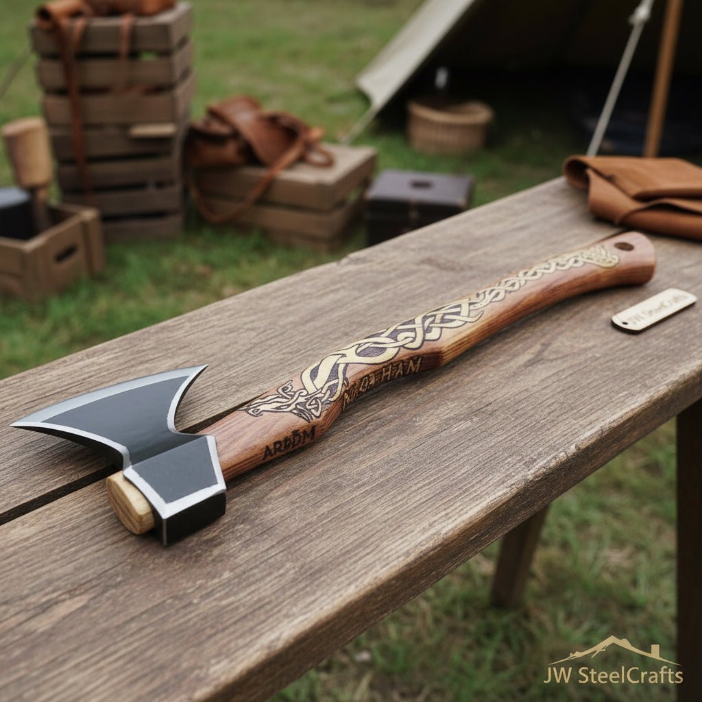 Hand-Forged Viking Bearded Camp Axe with Engraved Hardwood Handle. Built for camp chores, kindling, and trail work. The bearded edge gives extra bite and control for close cuts.