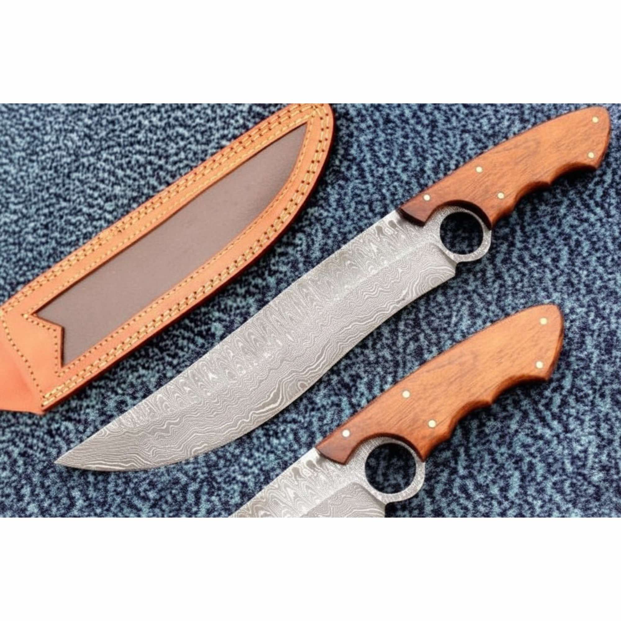 The rosewood handle offers a stable grip with natural texture and balanced weight distribution. Its full tang construction improves durability and structural integrity, allowing the knife to feel secure and controlled in hand. The integrated finger choil allows improved precision during detailed cutting tasks, while the leather sheath protects the blade during storage and transport.