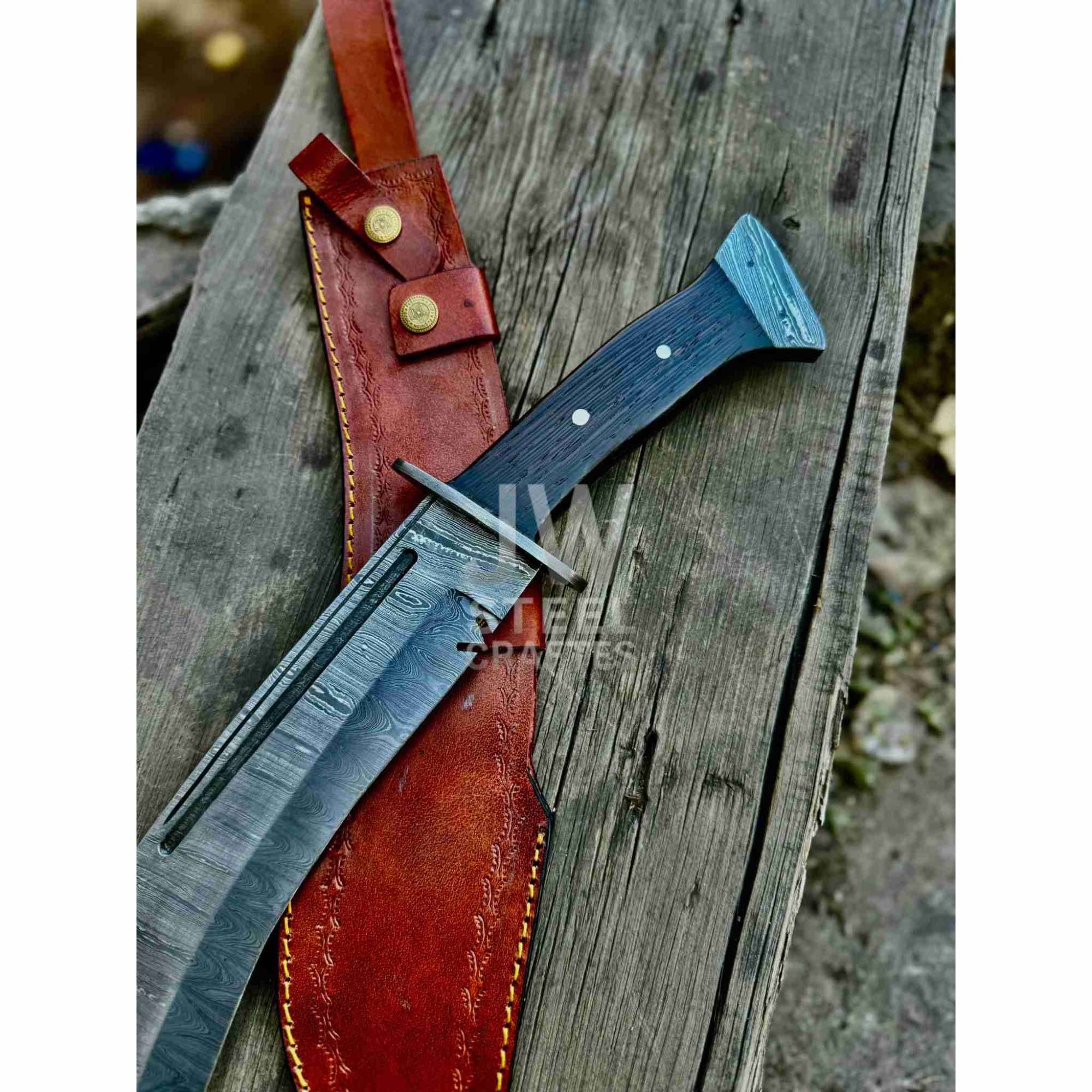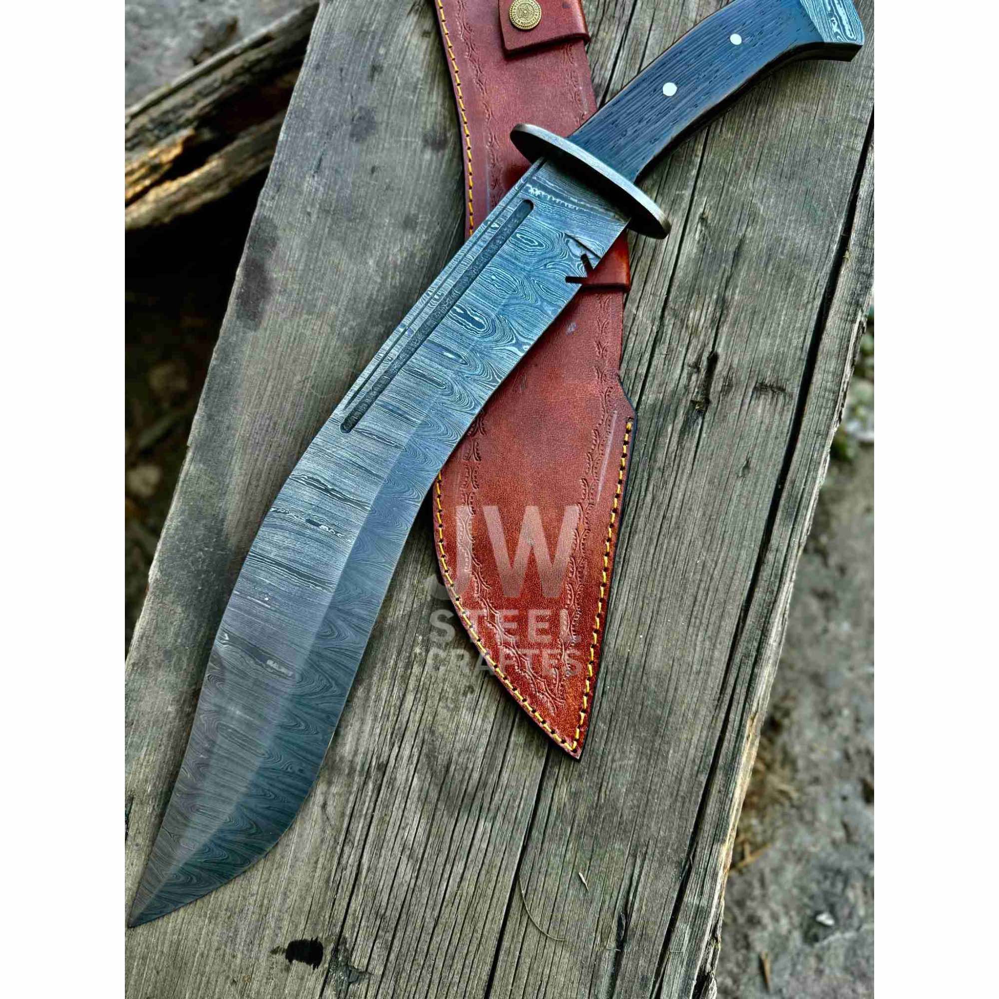 This kukri-inspired Bowie knife represents a hybrid of traditional Himalayan and American frontier blade design. Collectors interested in traditional clip point profiles may also explore the Dundee clip point Bowie knife, or browse the complete JW SteelCrafts Damascus Bowie knife collection.