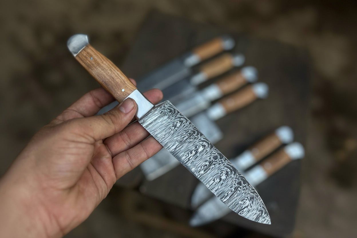 The blades are individually forged, heat treated, and hand finished to ensure durability and consistent cutting performance. Full tang construction improves structural strength and handling balance. The natural wood handles provide a secure grip and long-term reliability. Comparable handcrafted sets such as the 5-Piece Handmade Damascus Kitchen Knife Set – Olive Wood Handles and the 5-Piece Damascus Chef Knife Set with Leather Roll and Sharpening Rod are built for full kitchen functionality.