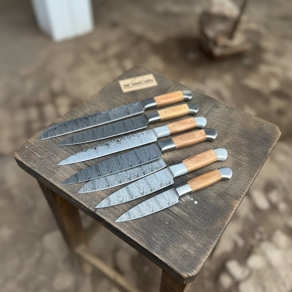 Handmade Damascus Chef Knife Set – 7-Piece Pattern-Welded Kitchen Knife Collection with Natural Wood Handles | JW SteelCrafts