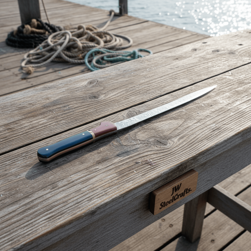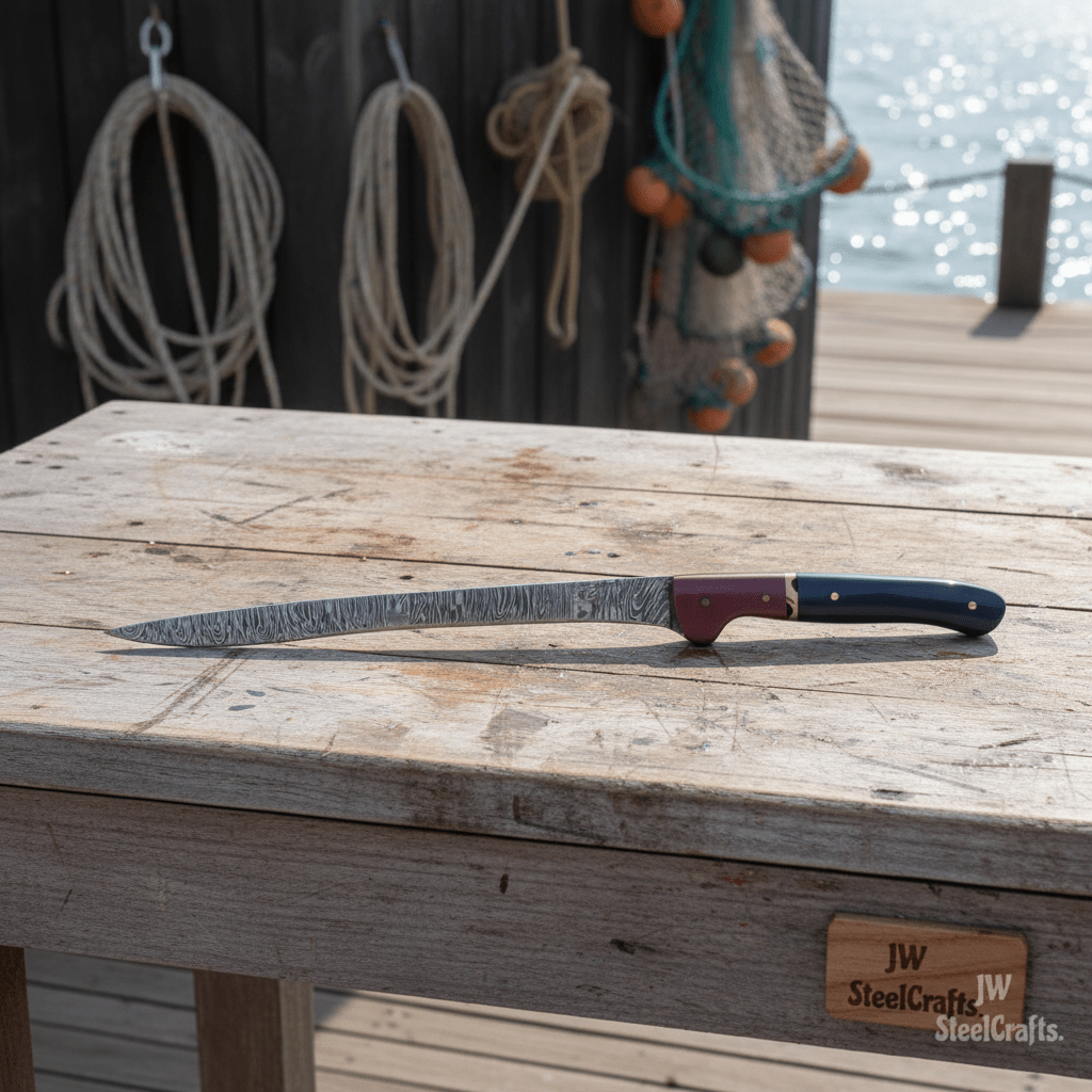 The blade uses pattern-welded Damascus steel to support edge retention and consistent cutting performance. The narrow geometry allows clean separation of meat and precise fish filleting. Full tang construction improves durability and maintains proper balance throughout the knife.