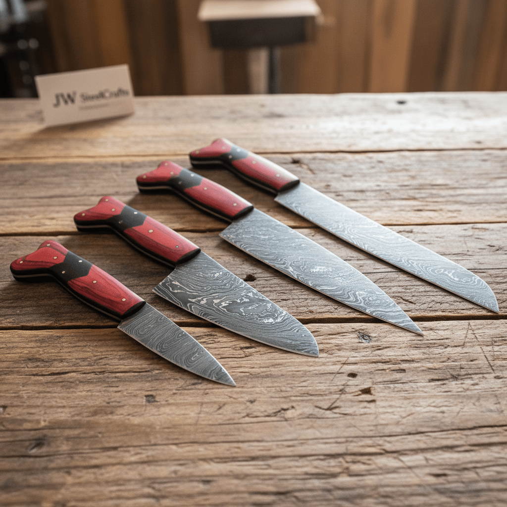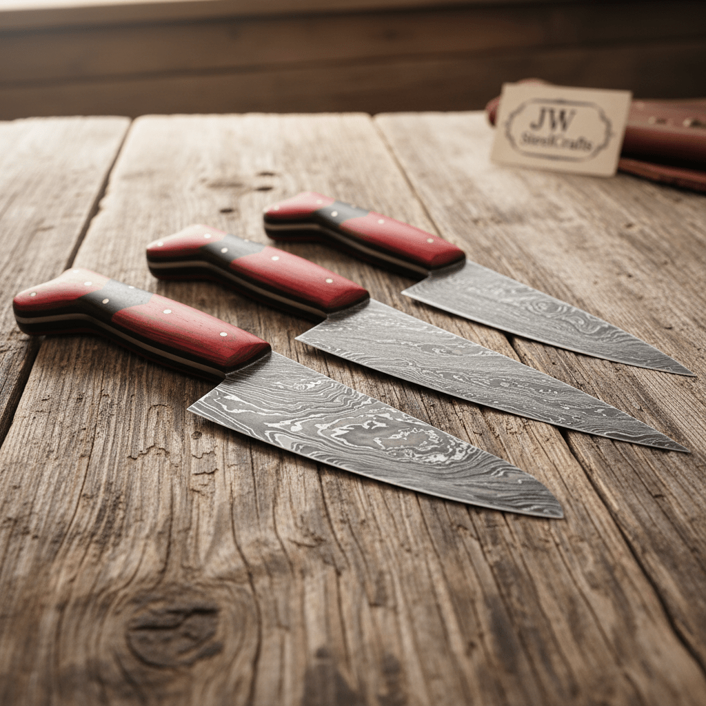 JW SteelCrafts produces handcrafted Damascus kitchen knives designed for durability, precision cutting, and dependable performance in professional and home kitchens.