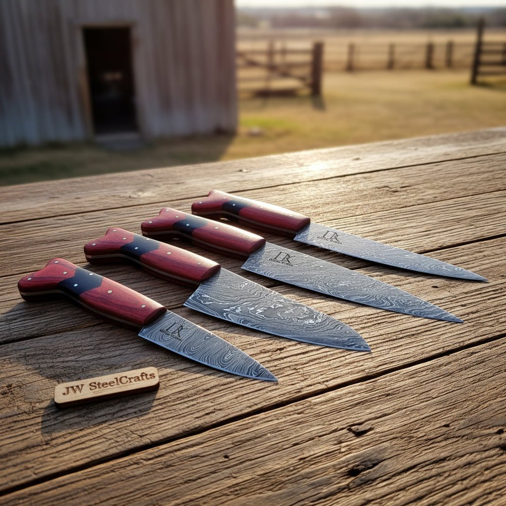 JW SteelCrafts 4 Piece Damascus Kitchen Knife Set — Chef, Carving, Utility & Precision Blades with Red Wood Handles