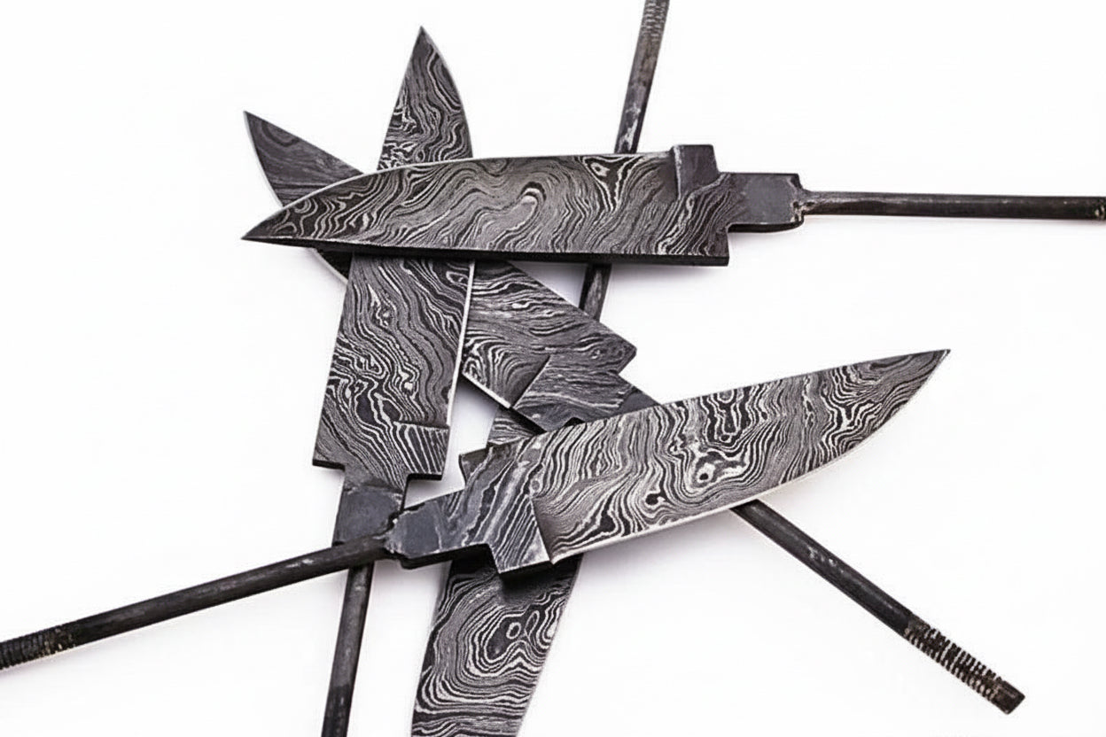 Discover the exquisite craftsmanship of the **5 Pieces Custom Handmade Damascus Steel Blank Blades / Knife Making Unready Blades /Hunting Knives DK-0146** by Divine Enterprises.