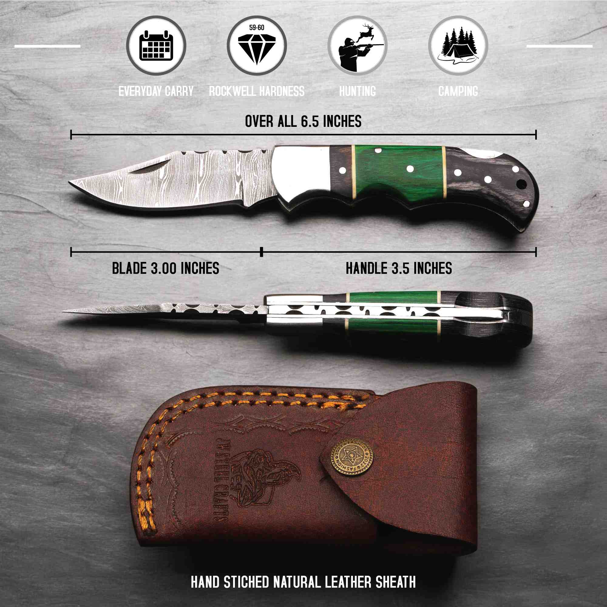 Designed for reliability, this folding knife performs well for camping, hiking, light hunting tasks, and everyday utility. A hand-stitched genuine leather sheath is included for safe storage and convenient carry.
