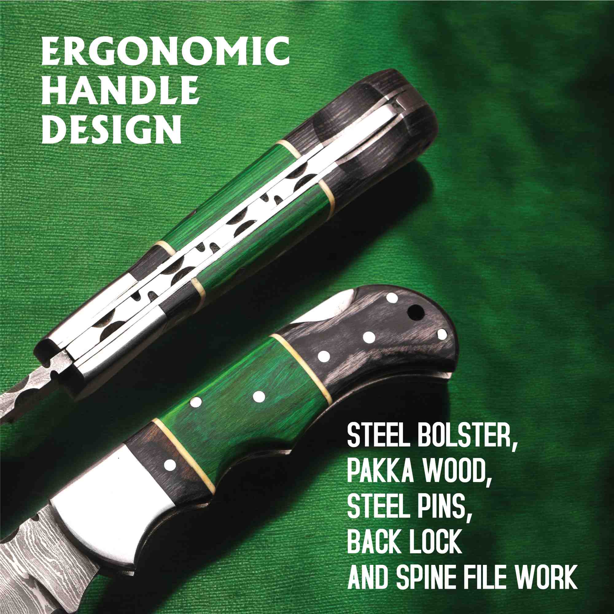 The ergonomic handle is crafted from premium Pakka wood, reinforced with steel pins and a solid steel bolster for strength and balance. A secure back-lock mechanism keeps the blade firmly in place during use, while the compact size makes it ideal for daily carry.