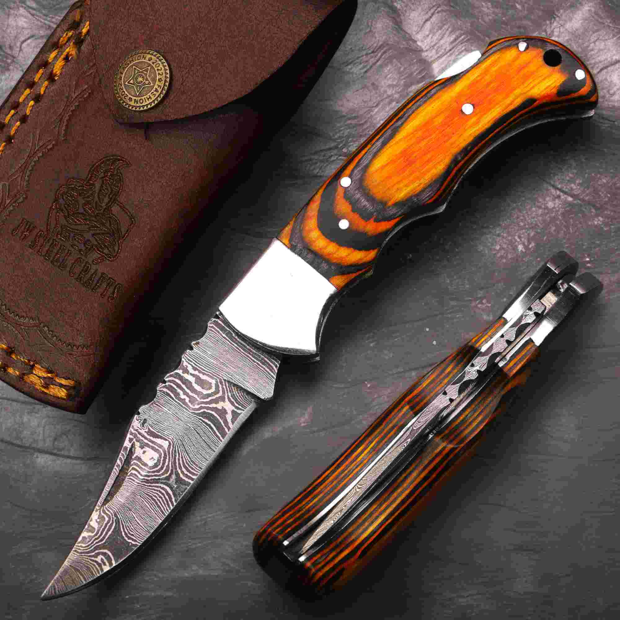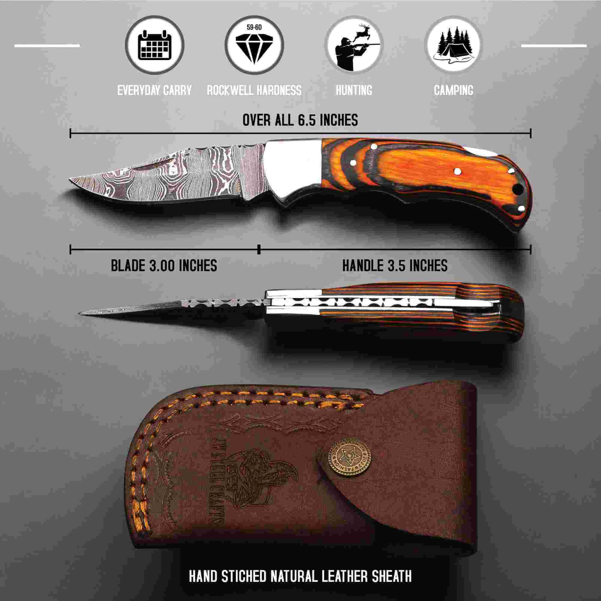 This folding knife is well suited for everyday carry (EDC), camping, outdoor use, hunting tasks, or as a meaningful handmade gift. Natural variations in Damascus steel patterns and wood grain are part of the handcrafted process and add to each knife’s individuality.