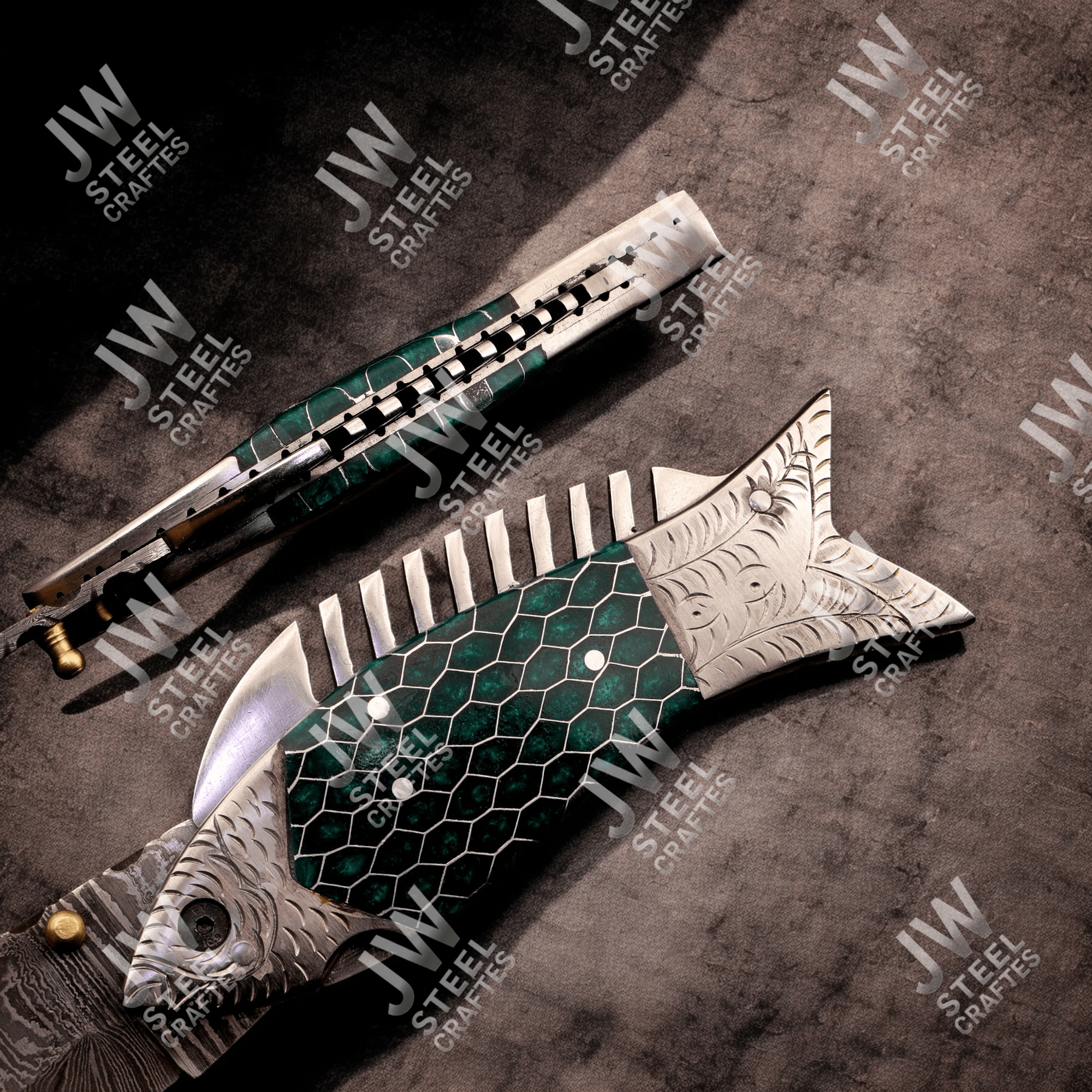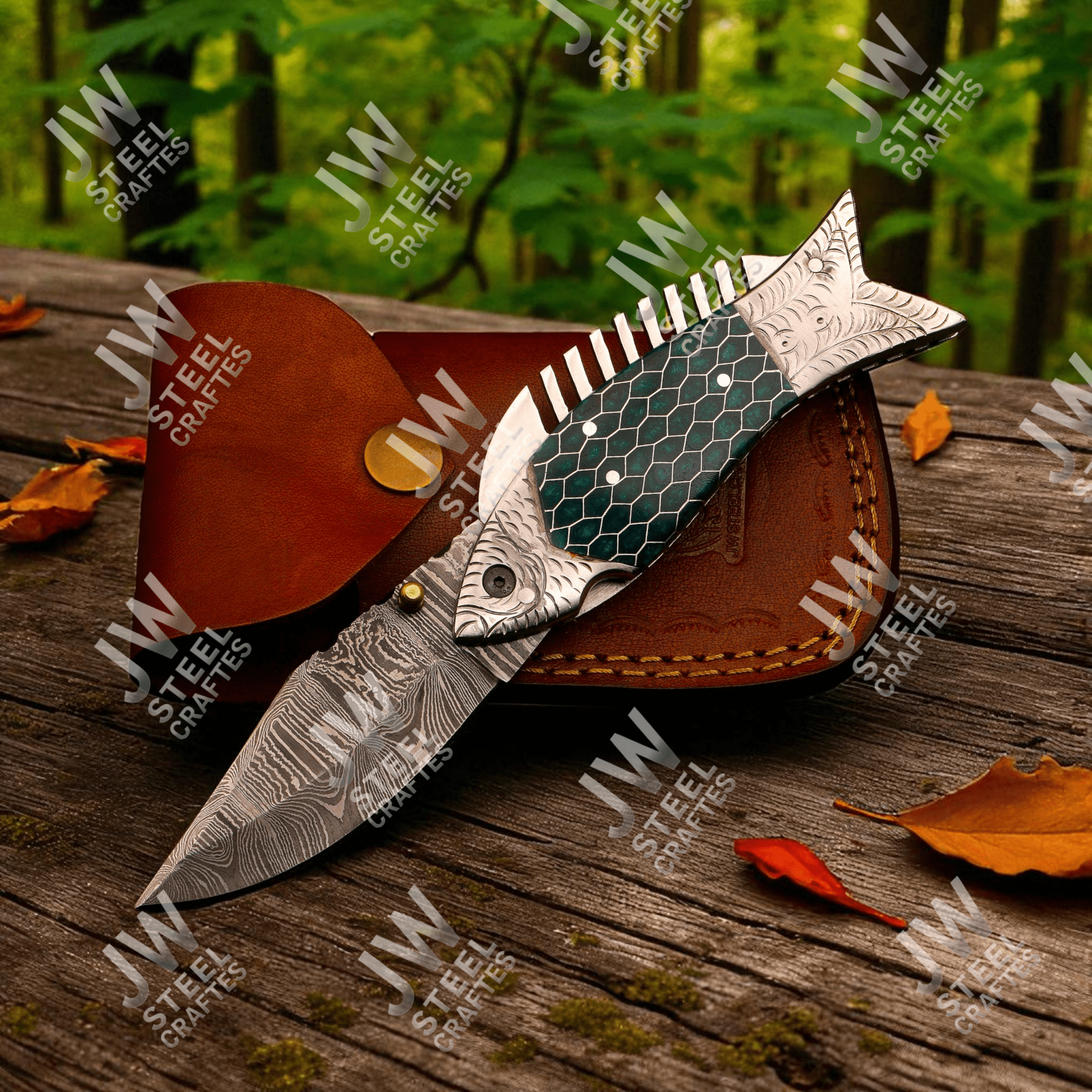 Handmade Damascus Folding Knife with Green Honeycomb Handle