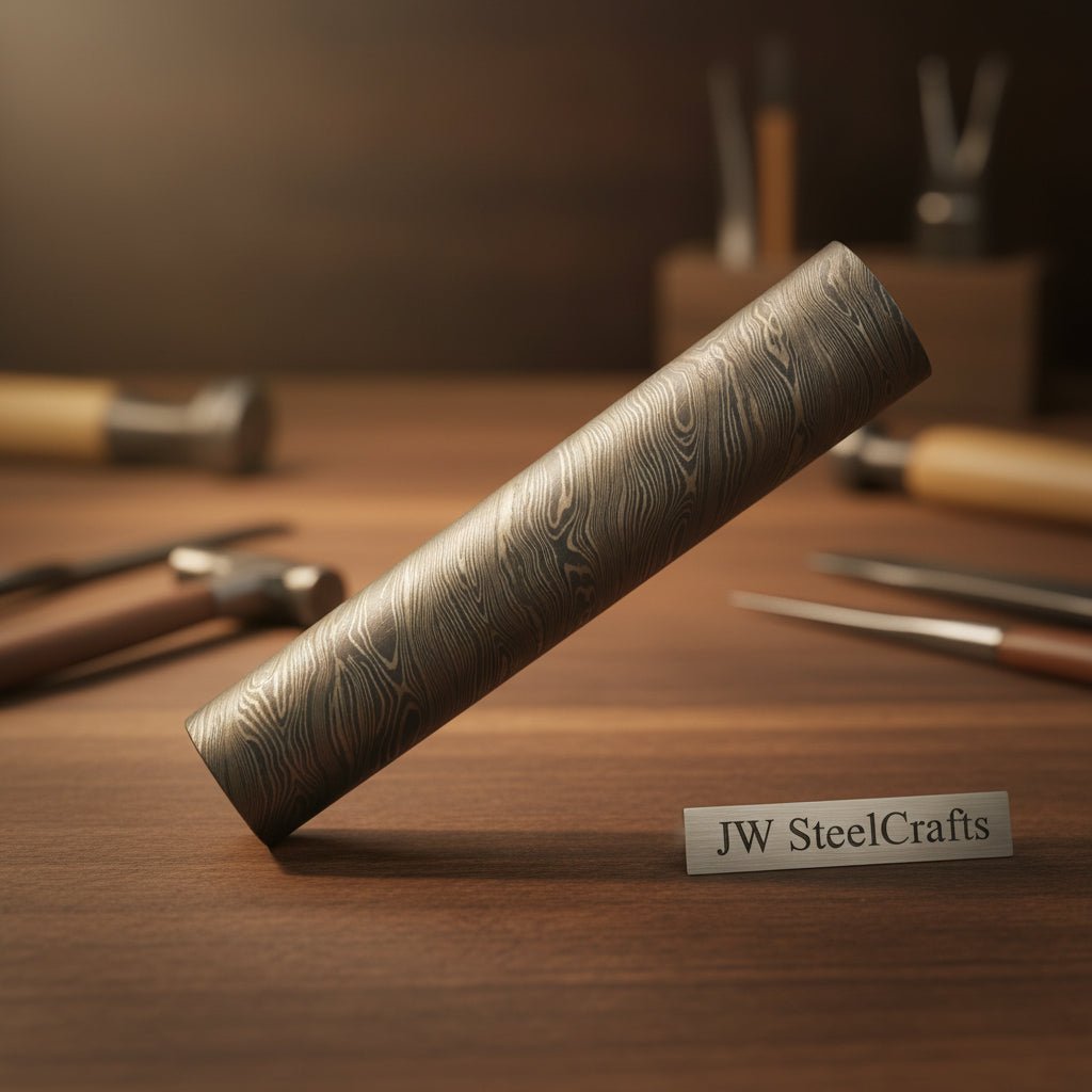 Discover the exquisite craftsmanship of the **4.10 Inches Damascus steel rod-round bar for Jewelry and Rings making DE-0070** by Divine Enterprises.