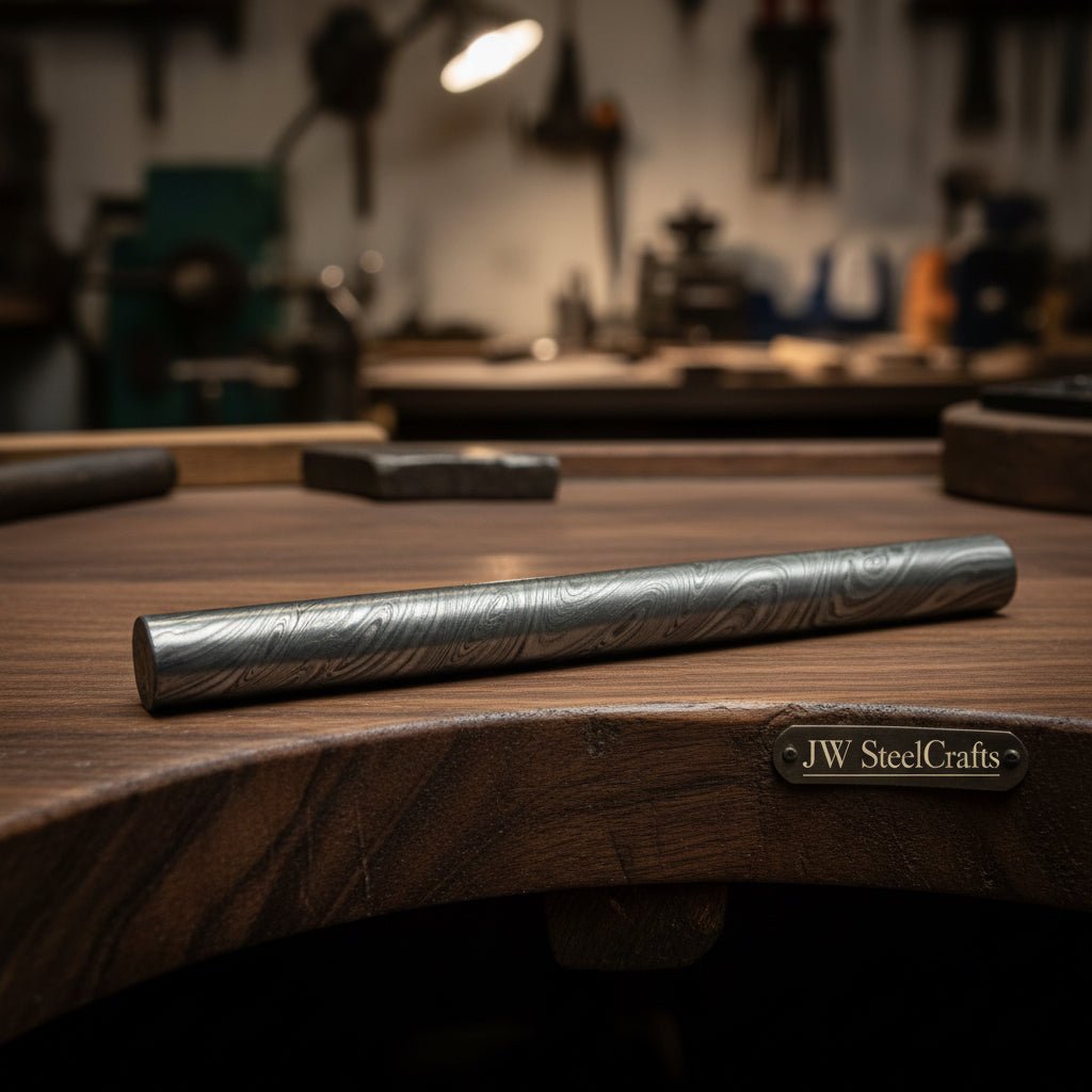 Discover the exquisite craftsmanship of the **Damascus Steel Round Billet Rod For Guard , Rings And Jewelery Making/ Raw Materials for Jewelery DK-0126** by Divine Enterprises.