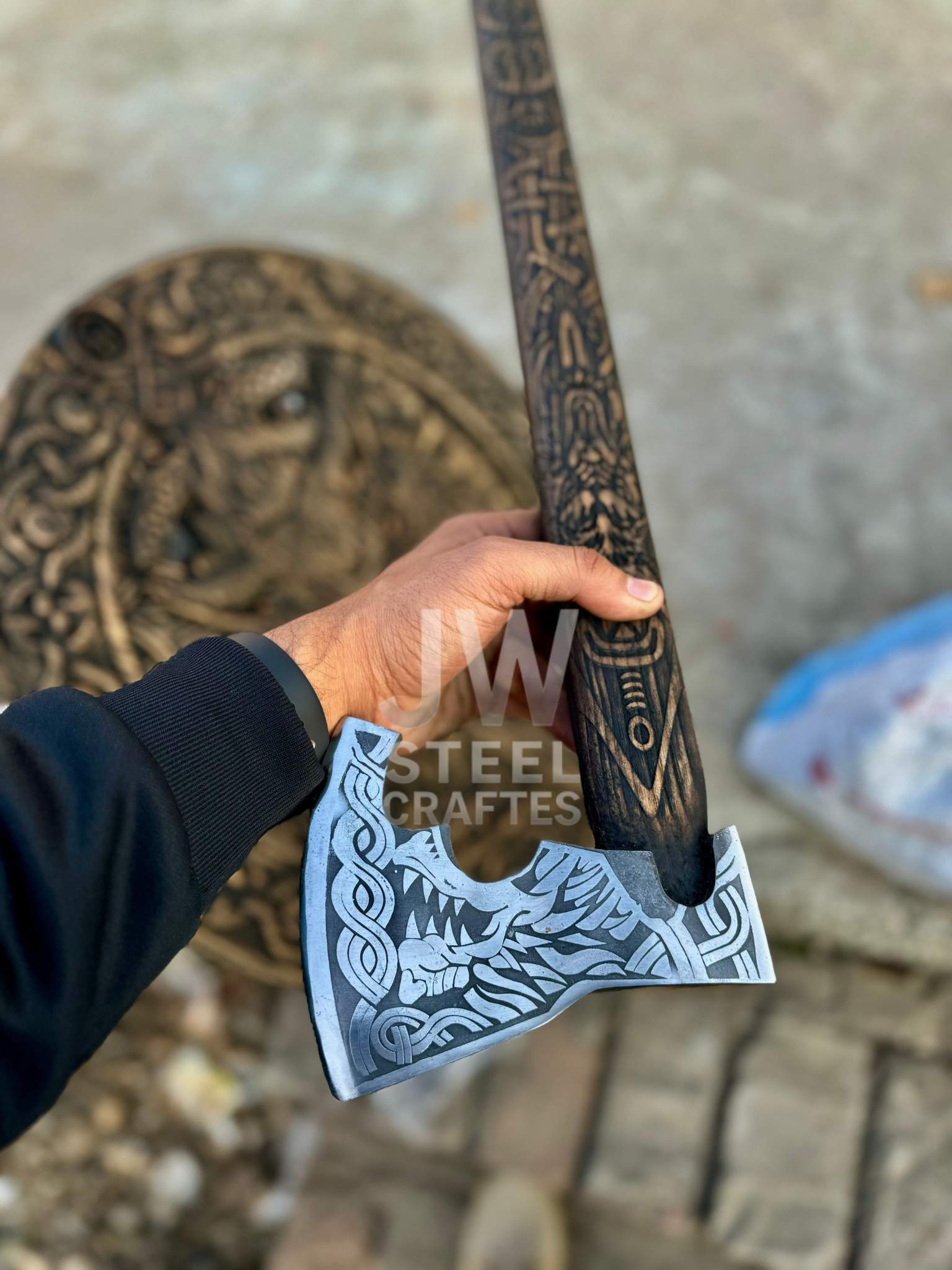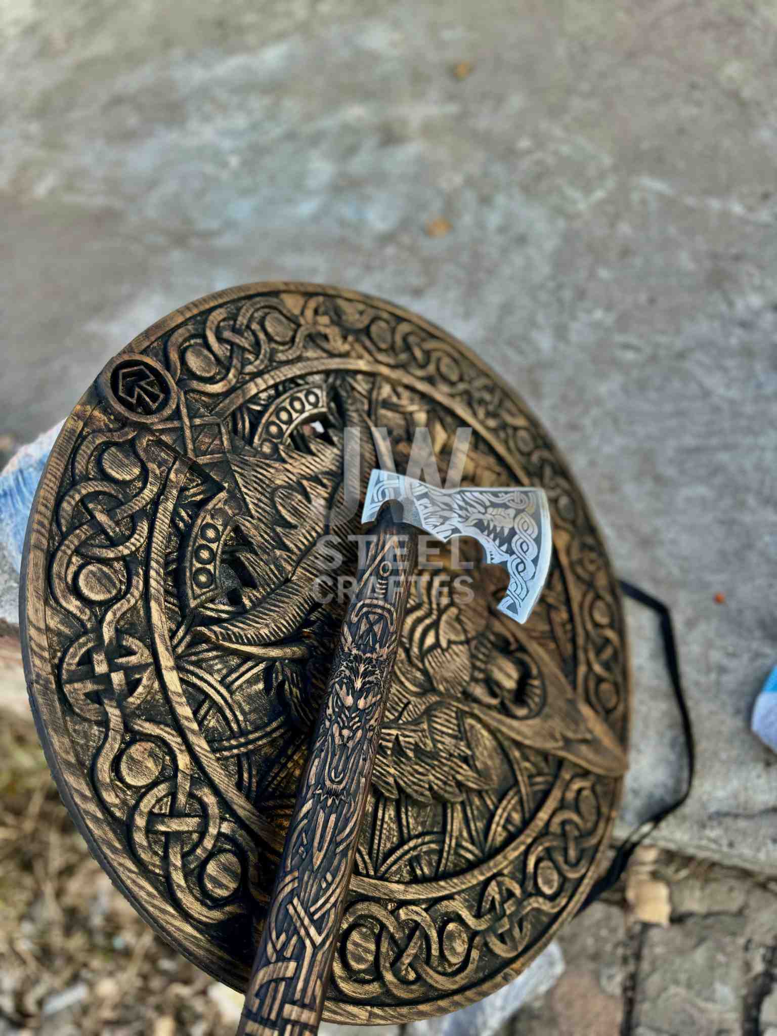 - Matching Viking shield and engraved axe design