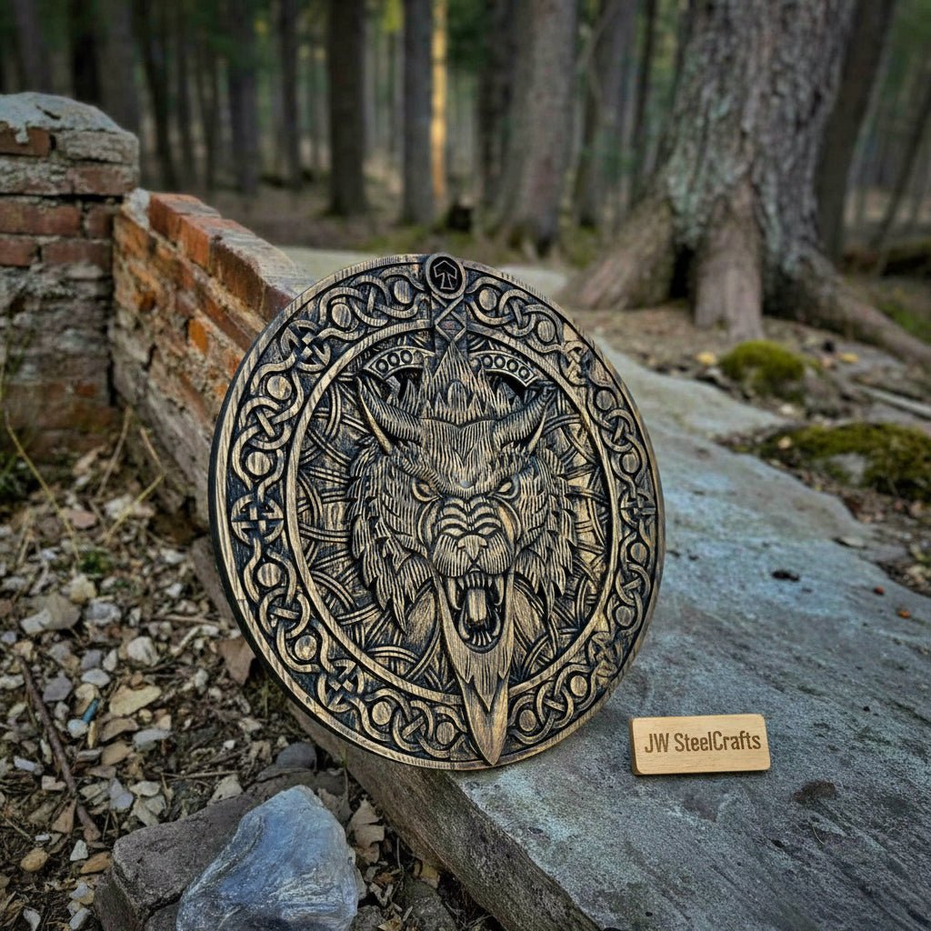 This handcrafted Viking shield and matching engraved axe form a complete Nordic art decor set. The shield features detailed carved knotwork and a central raven motif, while the axe displays coordinated Norse engravings on the blade and handle. Together, they create a bold focal point for wall display, themed interiors, or collector showcases.