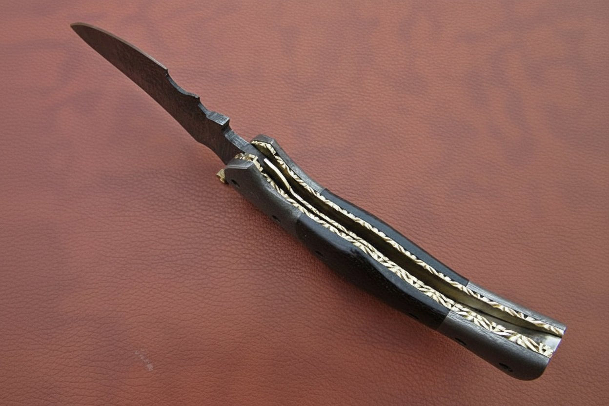 The handle is shaped from dark hardwood and contoured for a secure, comfortable grip. Decorative brass liners and hardware add visual contrast and reinforce the structure without sacrificing balance. The smooth folding action and solid lock make this knife reliable for everyday carry, outdoor use, or collection display.