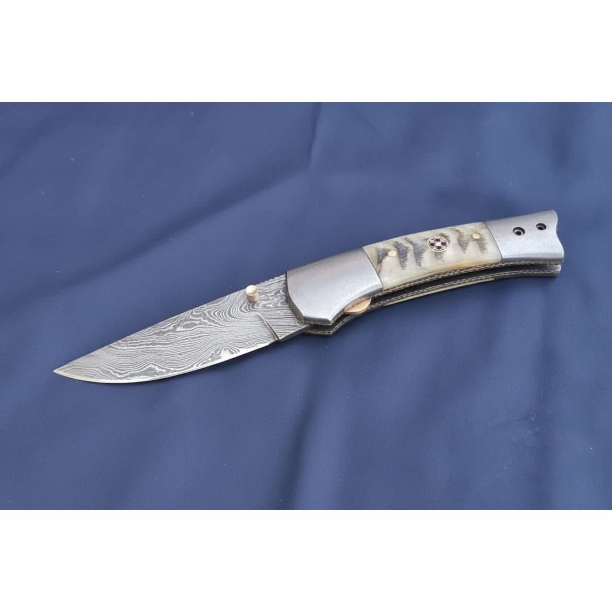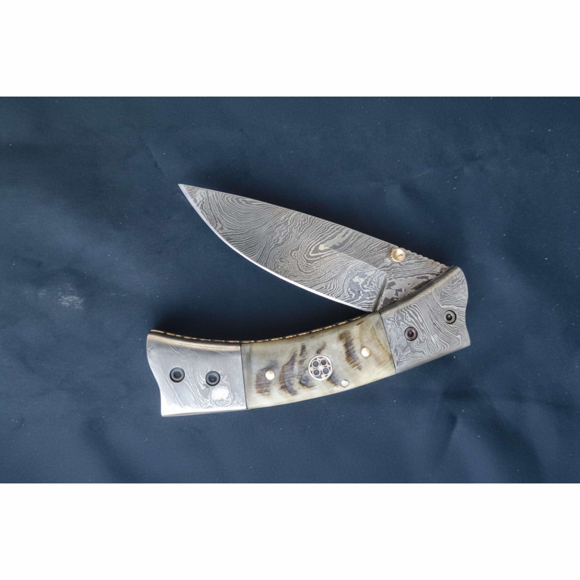 The handle features natural bone scales paired with Damascus steel bolsters, secured using brass pins and a decorative mosaic pin. Its gently curved profile offers a comfortable grip, while the smooth folding action ensures dependable daily use.