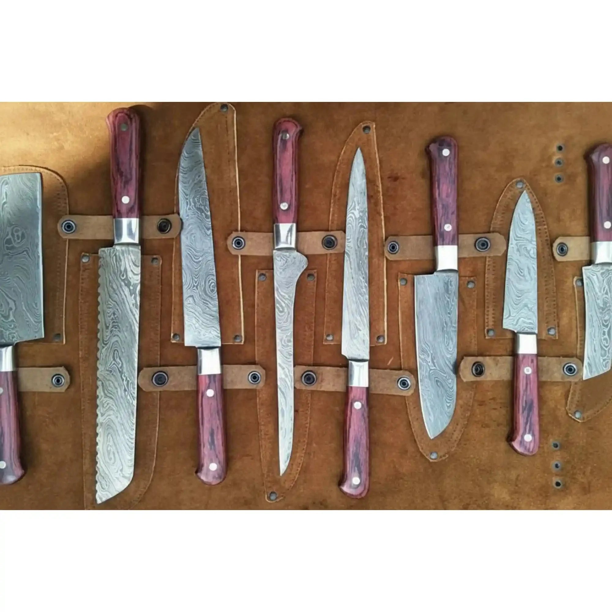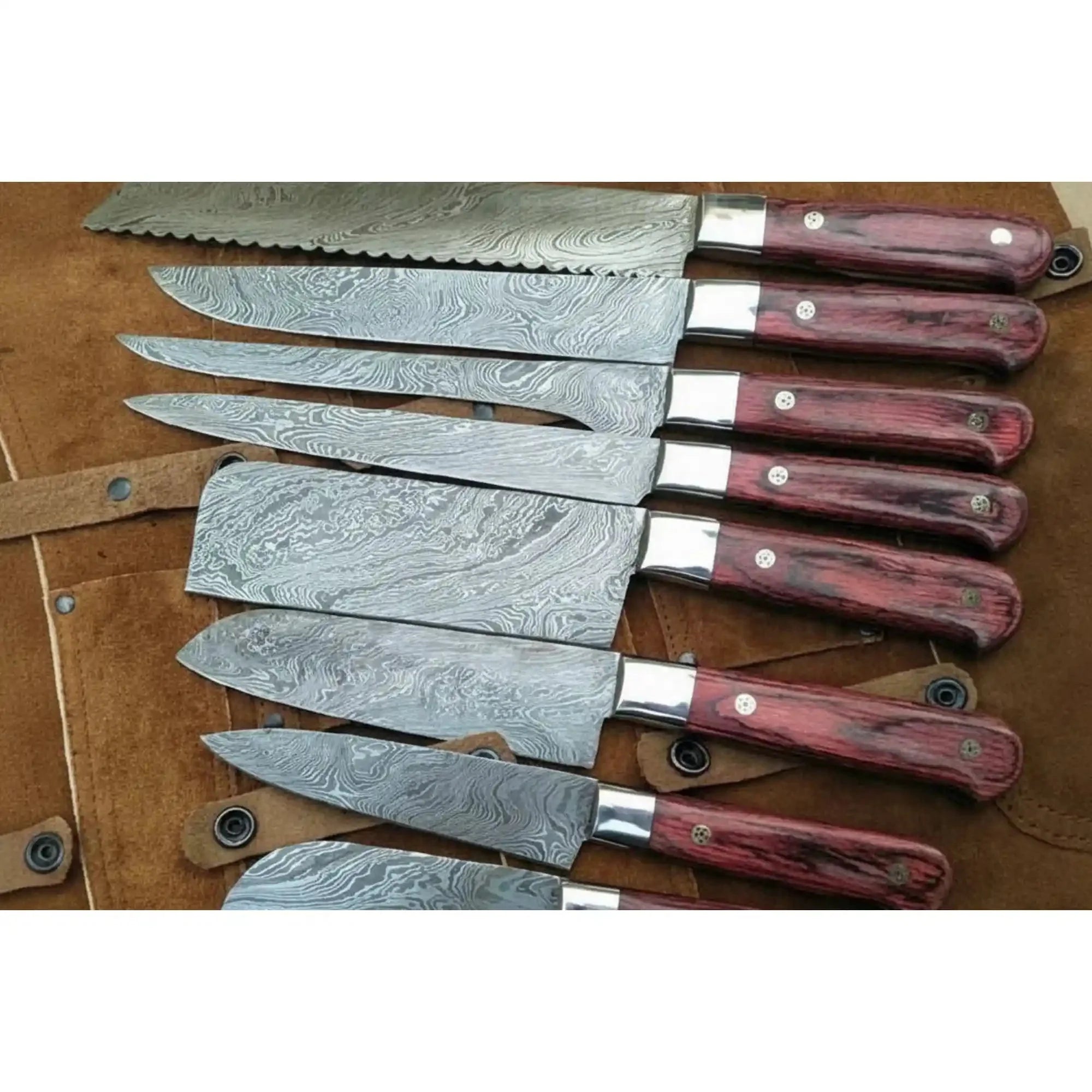 This 8-piece handmade Damascus chef knife set delivers full kitchen coverage for prep, slicing, trimming, and detailed cutting. Each blade is hand forged from layered Damascus steel and fitted with full tang construction for consistent balance and control. Red wood handles provide a secure grip and refined appearance. The included leather roll protects each knife and keeps the set organized for transport or storage.