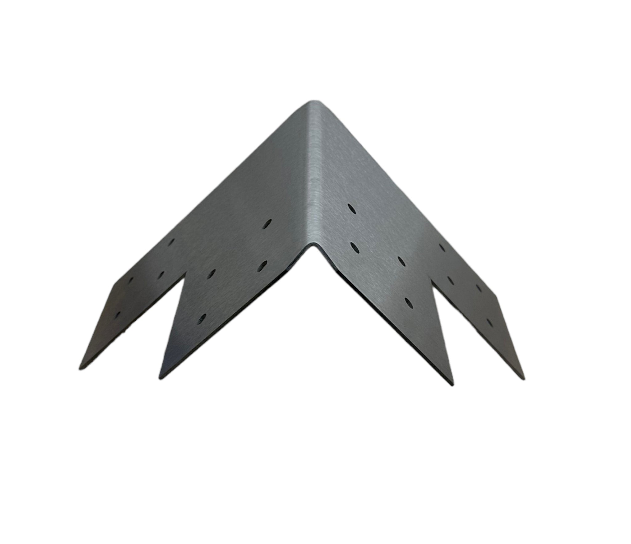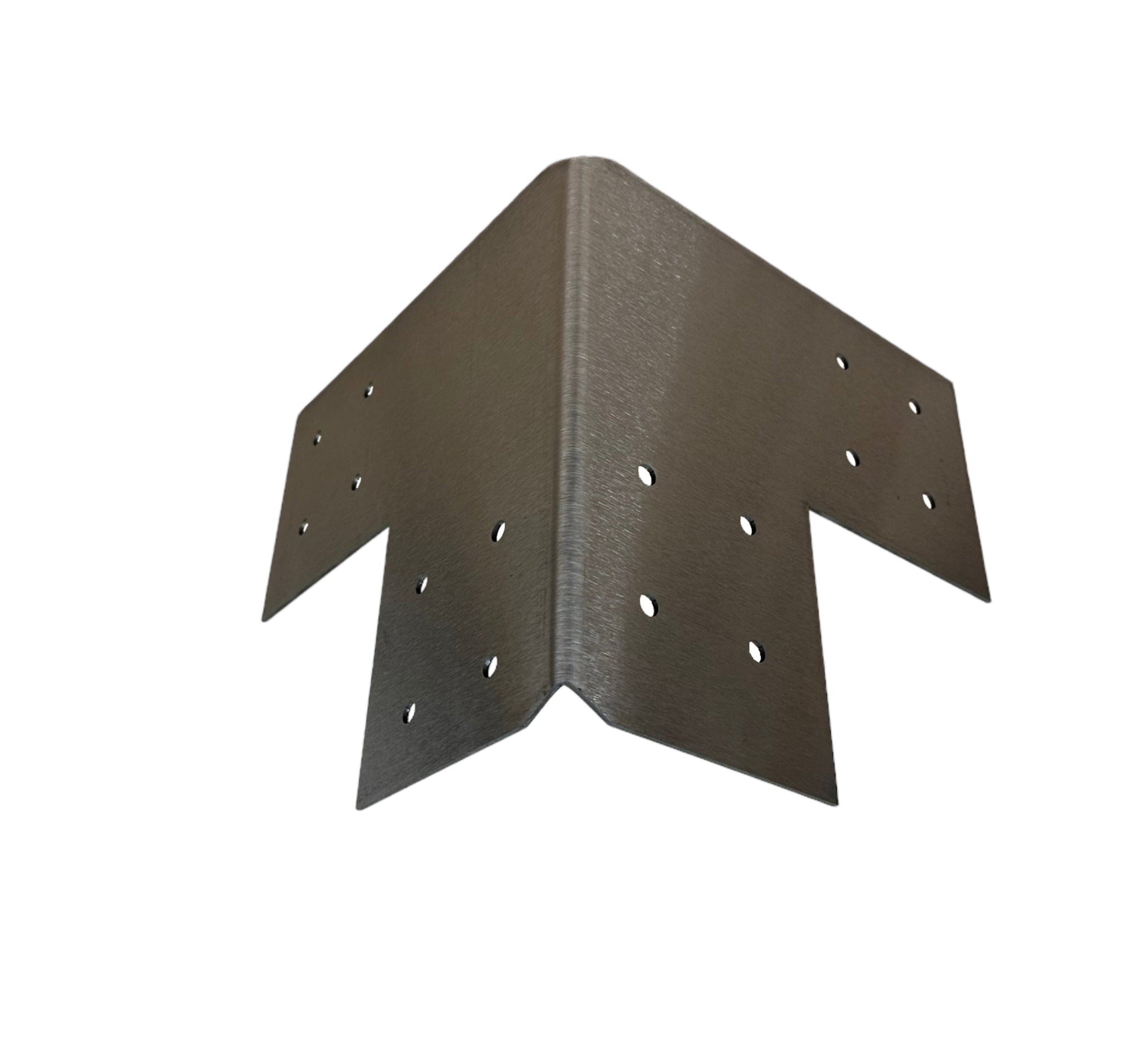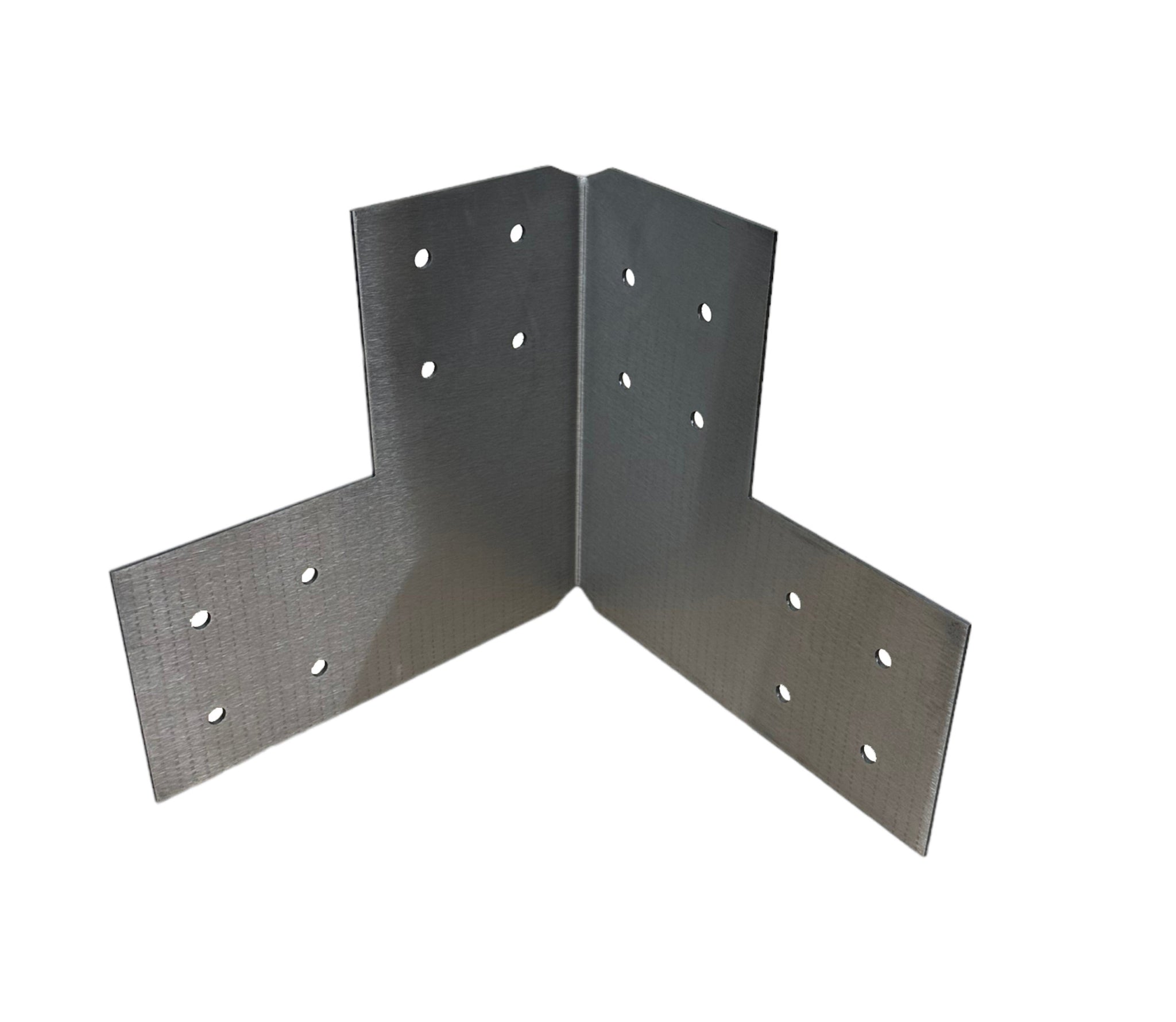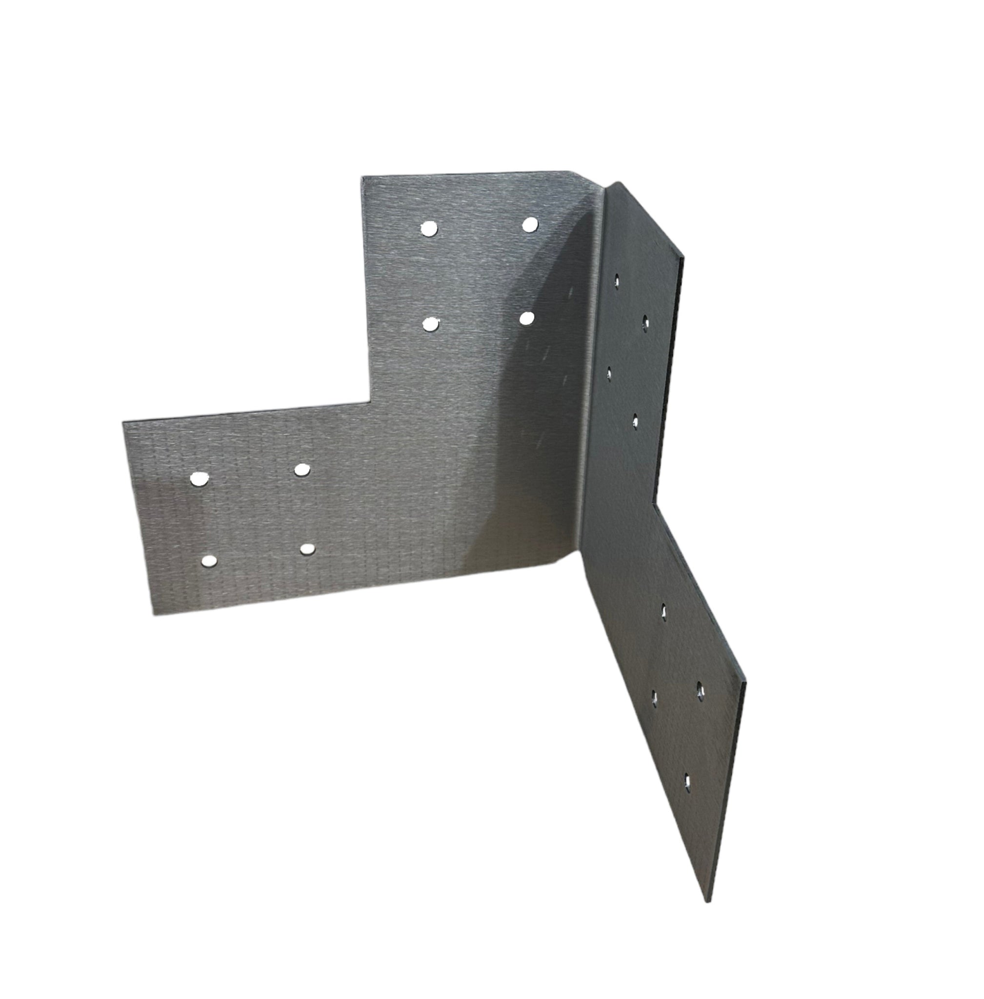 Outside Corner Brackets - bent at a 90 degree angle to fit over 6 x 6 post. (The holes for the legs are offset so you don't have to worry about hitting any of the other installed bolts!)